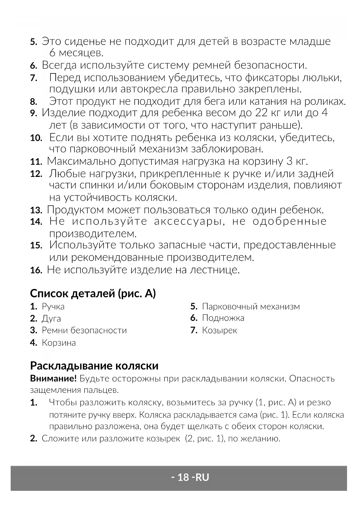 Любые нагрузки, прикрепленные к ручке и/или задней части спинки и/или боковым сторонам изделия, повлияют на устойчивость коляски.
