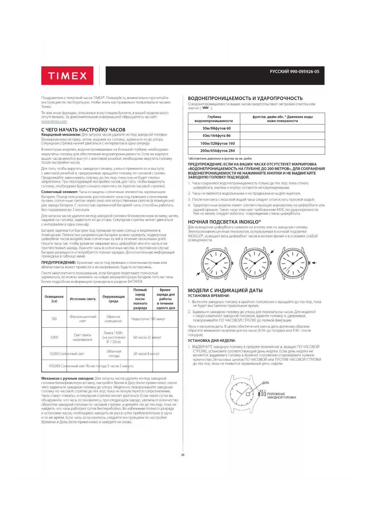 Timex では販売店または時計専門店で腕時計の電池を交換するように強くお勧めし ます。リセットボタンがある場合は、電池交換の際に押してください。電池の種類はケ ースバックに表記されています。電池の寿命は一定の使用条件を仮定して概算した ものです。電池の寿命は実際の使用方法によって異なります。 電池を焼却しないでください。再充電はできません。はずした電池はお子様の手が届 か な い ように 注 意し てください 。 TIMEX 国際保証書 www.timexwatch.jp/fs/timex/c/guide#returns ©2019 Timex Group USA, Inc. TIMEX、INDIGLO と QUICKDATE は Timex Group B.V. とその関連会社の登録商標です。 日本語 990-095926-0535 РУССКИЙ 990-095926-05 Поздравляем с покупкой часов TIMEX®. Пожалуйста, внимательно прочитайте инструкцию по эксплуатации, чтобы знать как правильно пользоваться часами Timex. Те или иные функции, описанные в настоящем буклете, в вашей модели могут отсутствовать. За дополнительной информацией обращайтесь на сайт: www.timex.com С ЧЕГО НАЧАТЬ НАСТРОЙКУ ЧАСОВ Кварцевый механизм: Для запуска часов удалите из-под заводной головки блокировочную вставку, затем, надавив на головку, задвиньте ее до упора. Секундная стрелка начнет двигаться с интервалом в одну секунду. В некоторых моделях, водонепроницаемых на большой глубине, необходимо «вкрутить» головку для обеспечения водонепроницаемости. Если на корпусе ваших часов имеется выступ с винтовой резьбой, необходимо вкрутить головку после настройки часов. Для того, чтобы вкрутить заводную головку, сильно прижмите ее к выступу с винтовой резьбой и, придерживая, вращайте головку по часовой стрелке. Продолжайте завинчивать головку до тех пор, пока она не будет плотно закреплена. При последующей настройке часов, для того, чтобы выдвинуть головку, необходимо будет сначала отвинтить ее (против часовой стрелки). Солнечный элемент: Часы оснащены солнечным элементом, заряжающим батарею. Перед пользованием, расположите часы под прямыми солнечными лучами, солнечным светом через окно или искусственным светом (в помещении) для заряда батареи. С полностью заряженной батареей часы способны работать без подзарядки до 2 месяцев. Для запуска часов удалите из-под заводной головки блокировочную вставку, затем, надавив на головку, задвиньте ее до упора. Секундная стрелка начнет двигаться с интервалом в одну секунду. Батарея заряжается быстрее под прямыми лучами солнца и медленнее в помещении. Полностью разряженную батарею можно зарядить, подвергнув циферблат часов воздействию солнечных лучей в течение нескольких дней. Носите часы так, чтобы рукав не закрывал весь циферблат или его часть и не препятствовал заряду. Храните часы в солнечных местах, в противном случае батарея разрядится и потребуется полная зарядка. Дополнительная информация приведена в таблице ниже. ПРЕДУПРЕЖДЕНИЕ: Хранение часов под прямыми солнечными лучами или вблизи лампы может привести к их нагреванию. Будьте осторожны. После многолетнего пользования, если батарея перестанет полностью заряжаться, ее можно заменить на новую аккумуляторную батарею того же типа. Более подробная информация приведена в разделе БАТАРЕЯ.