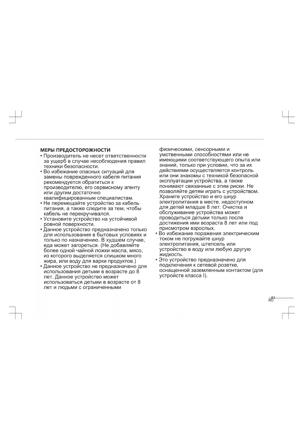 - Данное устройство предназначено только для использования в бытовых условиях и только по назначению. В худшем случае, еда может загореться. (Не добавляйте более одной чайной ложки масла, мясо, из которого выделяется слишком много жира, или воду для варки продуктов.)
