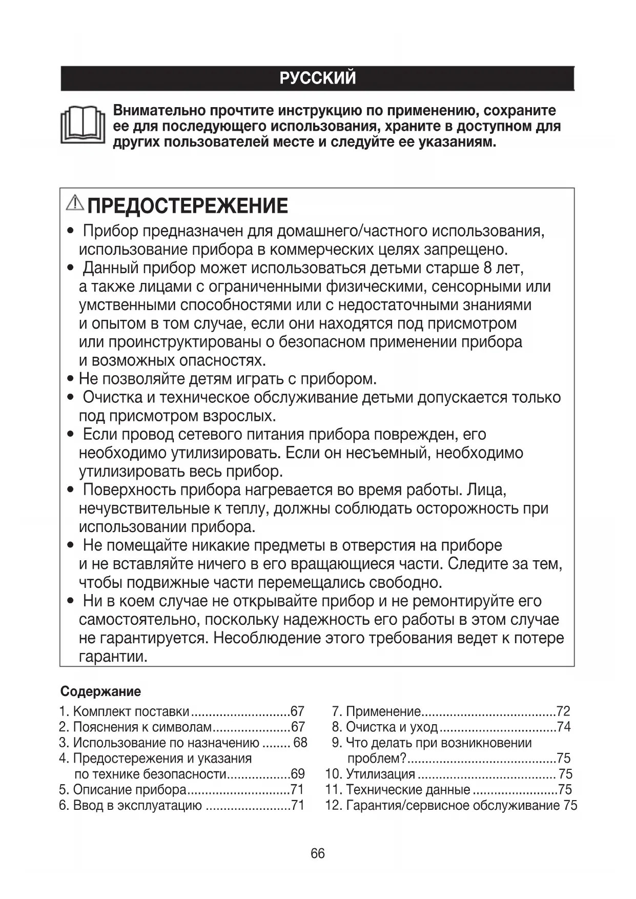 только сухими руками. Нетяните, неперекручивайте инеперегибайте сетевой кабель. Невставляйте внего иголки или другие острые предметы. Следите затем, чтобы сетевой кабель неукла- дывался наострые предметы инепроводился через них. Нивкоем случае непытайтесь взять прибор вруки, если онупал вводу. Немедленно извлеките вилку изрозетки. Неиспользуйте прибор или его принадлежности при на- личии видимых повреждений. Берегите прибор отударов ипадений.70 Ремонт прибора ПРЕДОСТЕРЕЖЕНИЕ Ремонт электроприборов должен выполняться только специалистами. Неквалифициро- ванное выполнение ремонта влечет засобой значительную опасность для пользователя. Если прибор нуждается времонте, обратитесь всервисную службу или кавторизо- ванному торговому представителю. Опасность пожара ПРЕДОСТЕРЕЖЕНИЕ Использование прибора непоназначению или несоблюдение правил, указанных вдан- ной инструкции поприменению, при определенных обстоятельствах может привести