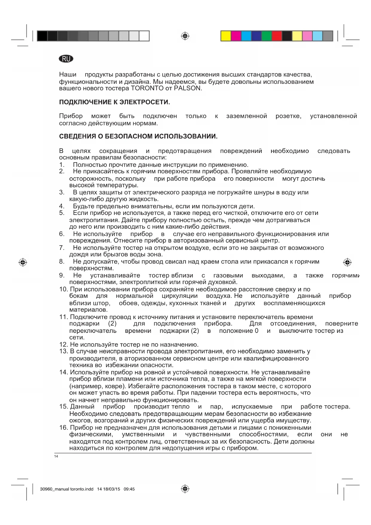 пользуетесьприбором. УХод и чисткА - Преждечемприступитькчисткеприбора,выключитетостер,выдернитевилку изсетиэлектропитанияидайтеемуполностьюостыть. - Используйтевлажнуютканьдлячисткивнешнейчастиприбора.Непогружайте тостервводу,а такжене позволяйте,чтобыонбылв контактес какой-либо другойжидкостью. - Не используйте металлические приборы, поскольку они могут повредить приборилипривестикфизическимповреждениям. - Необходимоизвлечьлюбые остаткипищисповерхноститостера(1)после завершенияегоработы.Неприменяйтеалюминиевыещеткиилигубки,атакже абразивныемоющиесредства. - Протеретьвнешнююповерхностьвлажнойтканьюинасухупросушить. - Придерживайте снимаемый поддон для крошек (3) за ручку и выньте его; удалитеостаткихлебныхкрошекисноваустановитеподдон. ЗАЩитА окрУЖАюЩеЙ средЫ Не выбрасывайте электрический прибор вместе с бытовым мусором. Данный приборнеобходимоотнестивпунктприемабытовыхотходовдляегопереработки. ГАрАнтиЯ и оБслУЖиВАние Принеобходимостиполучитьсервисноеобслуживание,атакжепривозникновении каких-либо проблем,перейдите на наш сайт www.palson.com или свяжитесьсо своимдистрибьютором. БлагодаримВасзадовериеивыбородногоизнашихприборов. 30960_manual toronto.indd 16 18/03/15 09:4517 30960_manual toronto.indd 17 18/03/15 09:45Pol. Ind. Les Ginesteres - C/ Hostalets, 2-4-6 08293 Collbató - Barcelona (Spain) Tel. +34 93 777 98 50 - Fax +34 93 777 93 07 www.palson.com e-mail: palson@palson.com