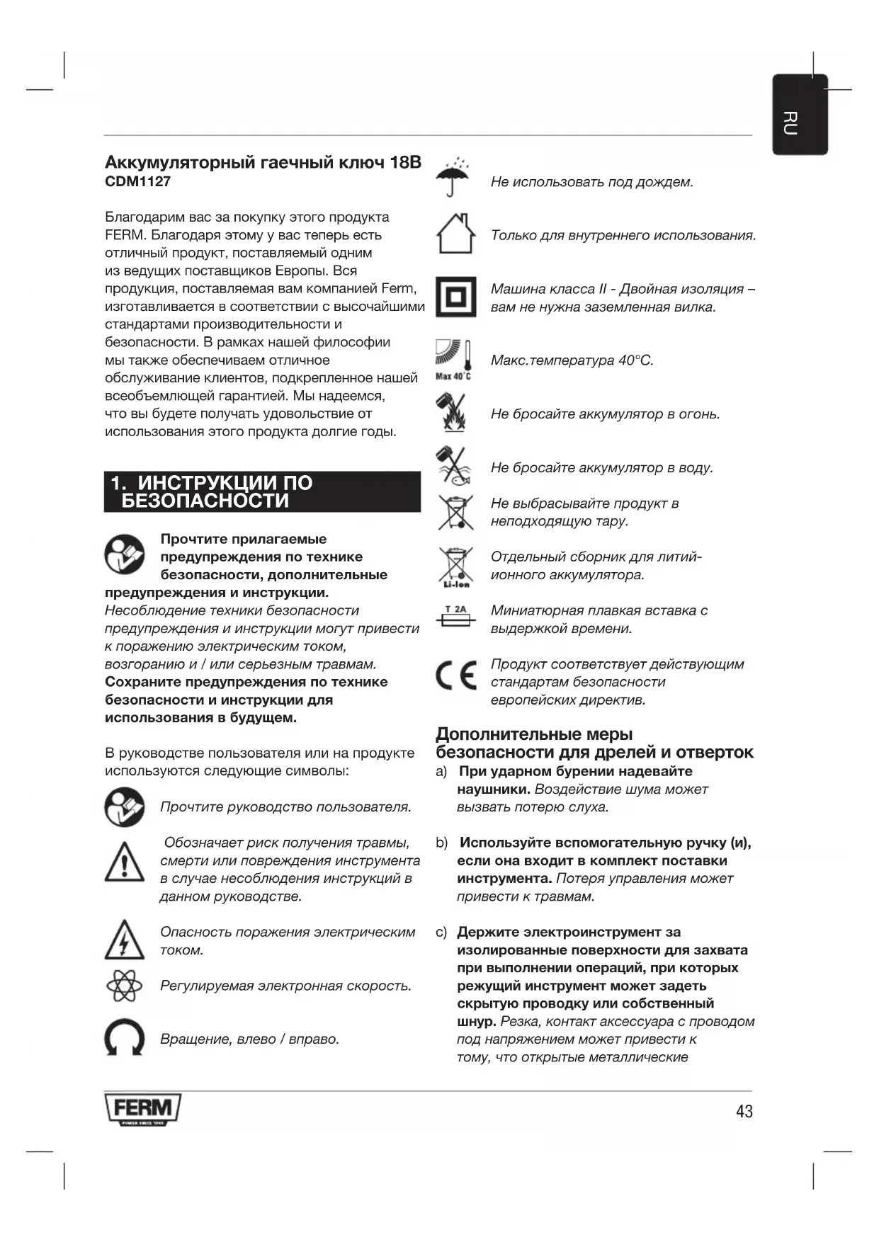 Аккумуляторный гаечный ключ 18В CDM1127 Благодарим вас за покупку этого продукта FERM. Благодаря этому у вас теперь есть отличный продукт, поставляемый одним из ведущих поставщиков Европы. Вся продукция, поставляемая вам компанией Ferm, изготавливается в соответствии с высочайшими стандартами производительности и безопасности. В рамках нашей философии мы также обеспечиваем отличное обслуживание клиентов, подкрепленное нашей всеобъемлющей гарантией. Мы надеемся, что вы будете получать удовольствие от использования этого продукта долгие годы.