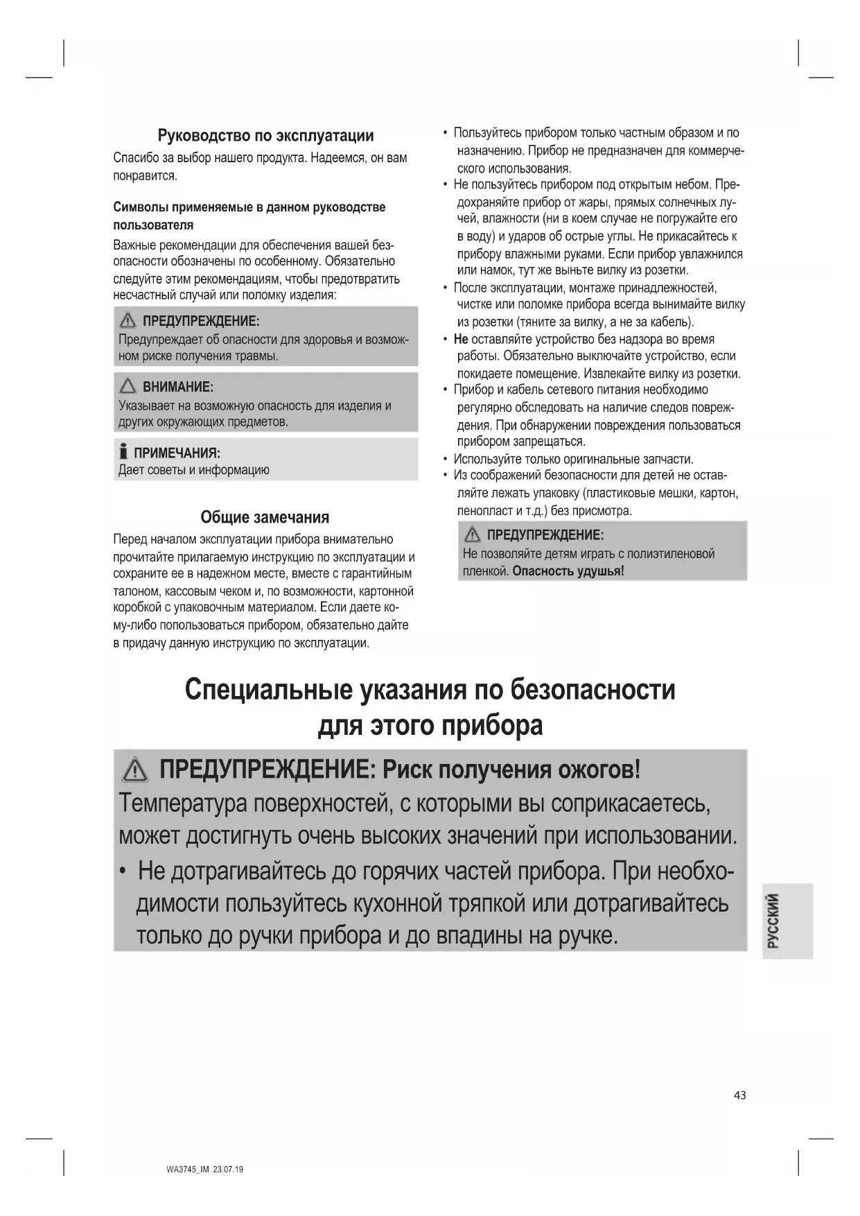 - Не дотрагивайтесь до горячих частей прибора. При необхо- димости пользуйтесь кухонной тряпкой или дотрагивайтесь только до ручки прибора и до впадины на ручке.WA3745_IM 23.07.19