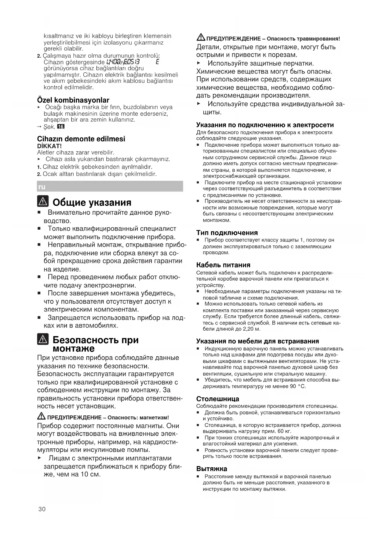 Указания по подключению к электросети Для безопасного подключения прибора к электросетисоблюдайте следующие указания.¡ Подключение прибора может выполняться только ав-торизованным специалистом или специально обучен-ным сотрудником сервисной службы. Данное лицодолжно иметь допуск согласно местным предписани-ям страны, в которой выполняется подключение, иэлектроснабжающей организации.¡ Подключите прибор на месте стационарной установкичерез соответствующий разъединитель в соответствиис предписаниями по установке.¡ Производитель не несет ответственности за неисправ-ности или возможные повреждения, которые могутбыть связаны с несоответствующим электрическиммонтажом. Тип подключения ¡ Прибор соответствует классу защиты 1, поэтому ондолжен эксплуатироваться только с заземляющимпроводом. Кабель питания Сетевой кабель может быть подключен к распредели-тельной коробке варочной панели или прилагаться кустройству.¡ Необходимые параметры подключения указаны на ти-повой табличке и схеме подключения.¡ Можно использовать только сетевой кабель изкомплекта поставки или заказанный через сервиснуюслужбу. Если требуется более длинный кабель, свяжи-тесь с сервисной службой. В наличии есть сетевые ка-бели длиной до 2,20м. Указания по мебели для встраивания ¡ Индукционную варочную панель можно устанавливатьтолько над шкафами для подогрева посуды или духо-выми шкафами с вытяжными вентиляторами. Не уста-навливайте под варочной панелью духовой шкаф безвентиляции, сушильную или стиральную машину.¡ Убедитесь, что мебель для встраивания способна вы-держивать температуру не менее 90°C. Соблюдайте рекомендации производителя столешницы.¡ Должна быть ровной, устанавливаться горизонтальнои устойчиво.¡ Столешница, в которую встраивается прибор, должнавыдерживать нагрузку прим. 60кг.¡ При тонких столешницах используйте жаропрочный ивлагостойкий материал для усиления.¡ Ровность установки варочной панели следует прове-рять только после встраивания. ¡ Расстояние между вытяжкой и варочной панельюдолжно быть не меньше расстояния, указанного винструкции по монтажу вытяжки.31 Подготовка мебели для встраивания