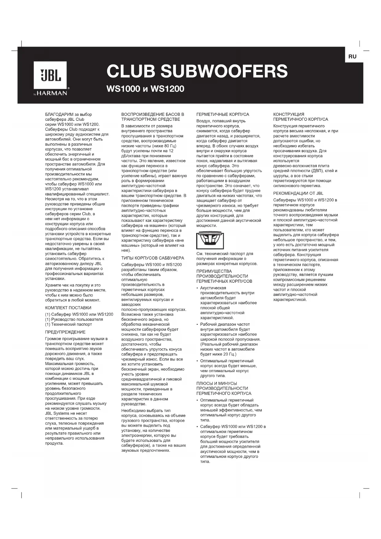 Храните чек на покупку и это руководство в надежном месте, чтобы к ним можно было обратиться в любой момент. КОМПЛЕКТ ПОСТАВКИ (1) Сабвуфер WS1000 или WS1200 (1) Руководство пользователя (1) Технический паспорт ПРЕДУПРЕЖДЕНИЕ Громкое проигрывание музыки в транспортном средстве может помешать восприятию звуков дорожного движения, а также повредить ваш слух. Максимальная громкость, которой можно достичь при помощи динамиков JBL в комбинации с мощным усилением, может превышать уровень безопасного продолжительного прослушивания. При езде рекомендуется слушать музыку на низком уровне громкости. JBL Systems не несет ответственность за потерю слуха, телесные повреждения или материальный ущерб в результате правильного или неправильного использования