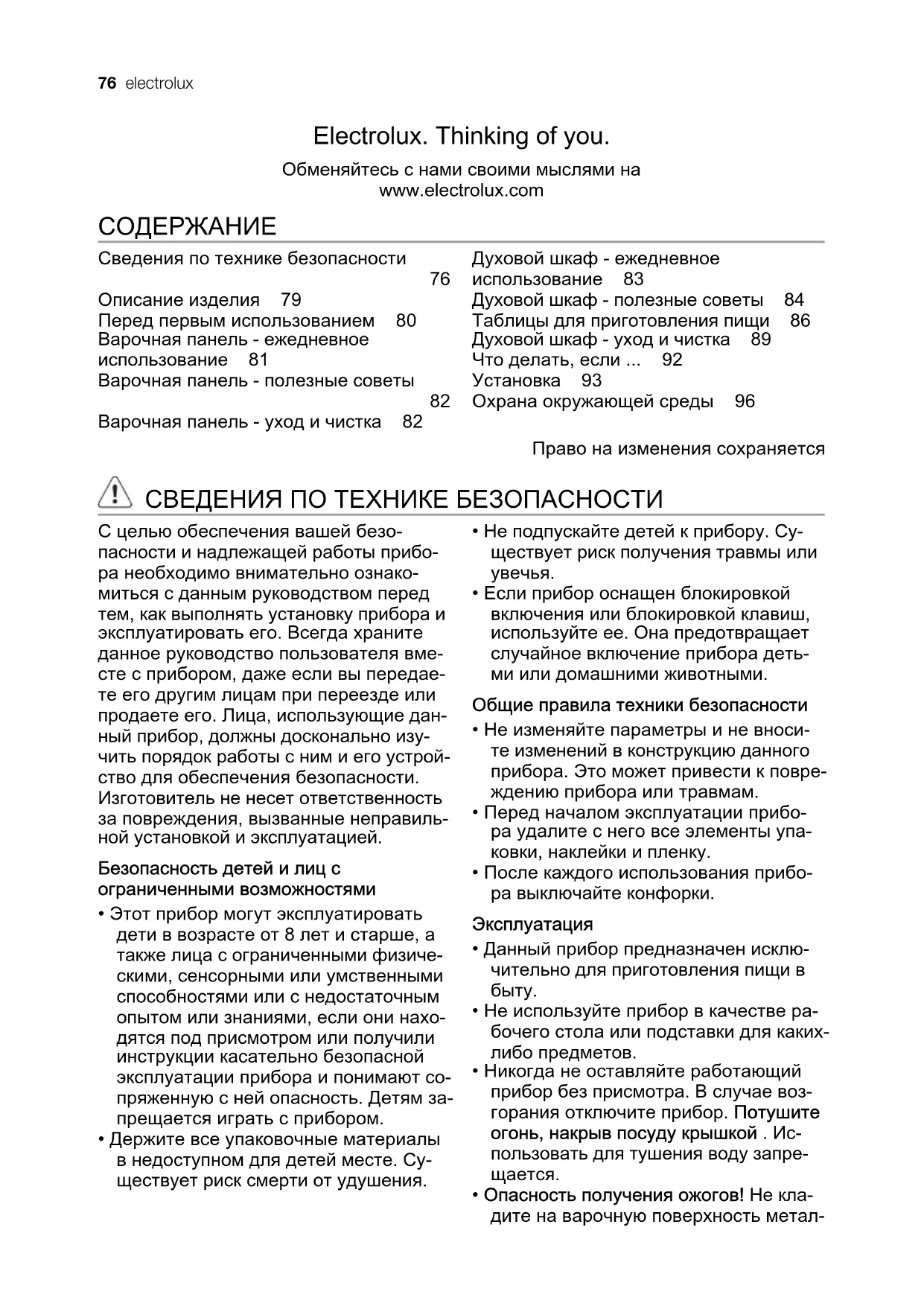 Варочная панель - уход и чистка 82 Духовой шкаф - ежедневное использование 83 Духовой шкаф - полезные советы 84 Таблицы для приготовления пищи 86 Духовой шкаф - уход и чистка 89 Что делать, если ... 92 Установка 93 Охрана окружающей среды 96 Право на изменения сохраняется СВЕДЕНИЯ ПО ТЕХНИКЕ БЕЗОПАСНОСТИ С целью обеспечения вашей безо‐ пасности и надлежащей работы прибо‐ ра необходимо внимательно ознако‐ миться с данным руководством перед тем, как выполнять установку прибора и эксплуатировать его. Всегда храните данное руководство пользователя вме‐ сте с прибором, даже если вы передае‐ те его другим лицам при переезде или продаете его. Лица, использующие дан‐ ный прибор, должны досконально изу‐ чить порядок работы с ним и его устрой‐ ство для обеспечения безопасности. Изготовитель не несет ответственность за повреждения, вызванные неправиль‐ ной установкой и эксплуатацией. Безопасность детей и лиц с ограниченными возможностями