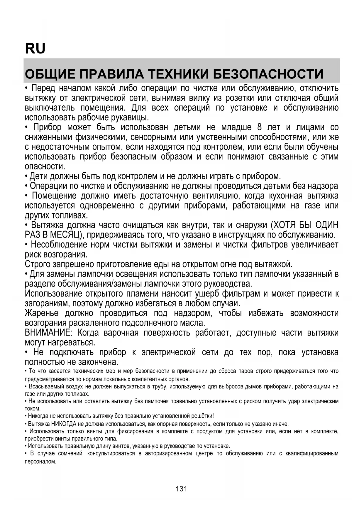 - Для замены лампочки освещения использовать только тип лампочки указанный в разделе обслуживания/замены лампочки этого руководства. Использование открытого пламени наносит ущерб фильтрам и может привести к загораниям, поэтому должно избегаться в любом случаи. Жаренье должно проводиться под надзором, чтобы избежать возможности возгорания раскаленного подсолнечного масла. ВНИМАНИЕ: Когда варочная поверхность работает, доступные части вытяжки могут нагреваться.