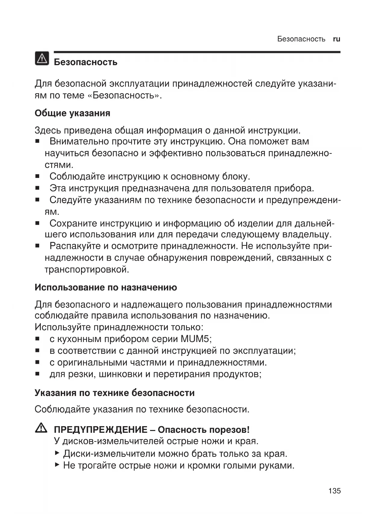 ¡ Сохраните инструкцию и информацию об изделии для дальней- шего использования или для передачи следующему владельцу. ¡ Распакуйте и осмотрите принадлежности. Не используйте при- надлежности в случае обнаружения повреждений, связанных с транспортировкой. Использование по назначению Для безопасного и надлежащего пользования принадлежностями соблюдайте правила использования по назначению. Используйте принадлежности только: ¡ с кухонным прибором серии MUM5; ¡ в соответствии с данной инструкцией по эксплуатации; ¡ с оригинальными частями и принадлежностями. ¡ для резки, шинковки и перетирания продуктов; Указания по технике безопасности Соблюдайте указания по технике безопасности. ПPEДYПPEЖДEНИE‒Опасность порезов! У дисков-измельчителей острые ножи и края.