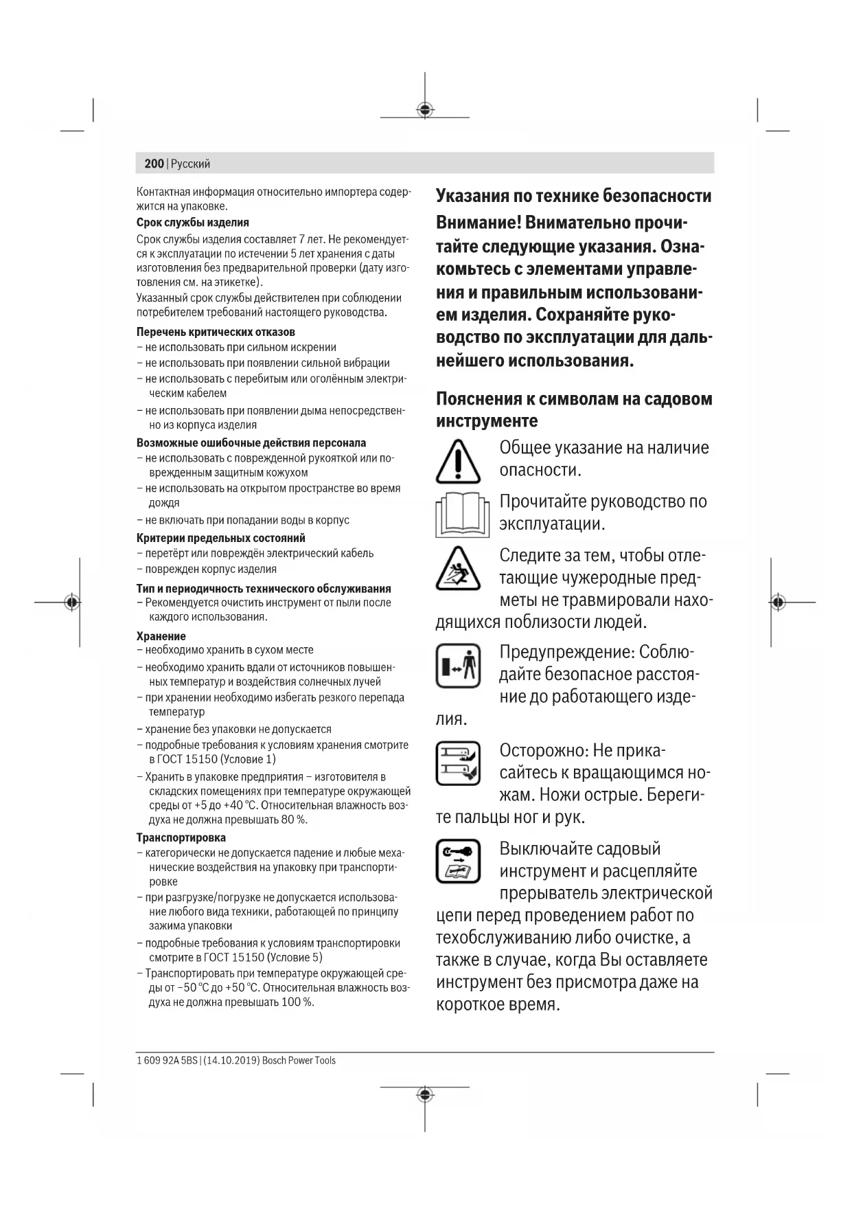 Toлько для стран Евразийского экономического союза (Таможенного союза) В состав эксплуатационных документов, предусмотрен- ных изготовителем для продукции, могут входить настоя- щее руководство по эксплуатации, а также приложения. Информация о подтверждении соответствия содержится в приложении. Информация о стране происхождения указана на корпу- се изделия и в приложении. Дата изготовления указана на последней странице об- ложки Руководства. Bosch Power Tools 1 609 92A 5BS | (14.10.2019)200 | Русский Контактная информация относительно импортера содер- жится на упаковке. Срок службы изделия Срок службы изделия составляет 7 лет. Не рекомендует- ся к эксплуатации по истечении 5 лет хранения с даты изготовления без предварительной проверки (дату изго- товления см. на этикетке). Указанный срок службы действителен при соблюдении потребителем требований настоящего руководства. Перечень критических отказов – не использовать при сильном искрении – не использовать при появлении сильной вибрации – не использовать с перебитым или оголённым электри- ческим кабелем – не использовать при появлении дыма непосредствен- но из корпуса изделия Возможные ошибочные действия персонала – не использовать с поврежденной рукояткой или по- врежденным защитным кожухом – не использовать на открытом пространстве во время
