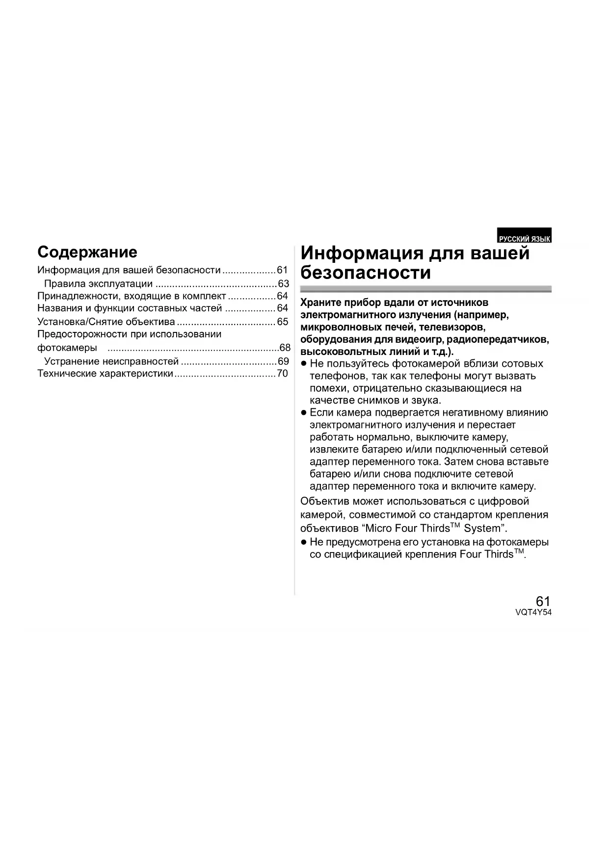 Если камера подвергается негативному влиянию электромагнитного излучения и перестает работать нормально, выключите камеру, извлеките батарею и/или подключенный сетевой адаптер переменного тока. Затем снова вставьте батарею и/или снова подключите сетевой адаптер переменного тока и включите камеру. Объектив может использоваться с цифровой камерой, совместимой со стандартом крепления объективов “Micro Four Thirds
