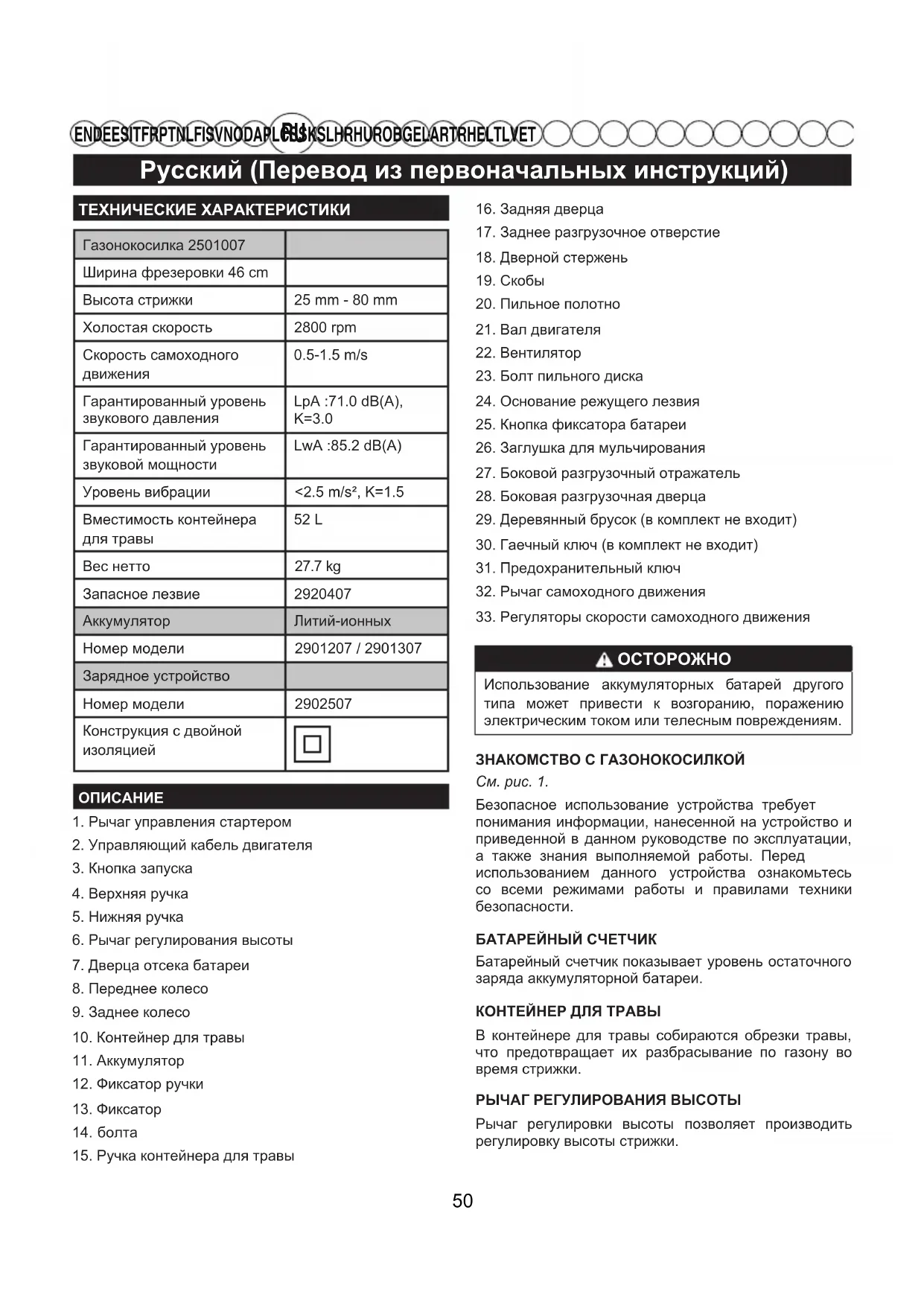 EN DE ES IT FR PT NL FI SV NO DA PL CS SK SL HR HU RO BG EL AR TR HE LT LV ET ТЕХНИЧЕСКИЕ ХАРАКТЕРИСТИКИГазонокосилка 2501007Ширина фрезеровки 46 cmВысота стрижки 25 mm - 80 mmХолостая скорость 2800 rpmСкорость cамоходногодвижения0.5-1.5 m/sГарантированный уровень звукового давленияLpA :71.0 dB(A), K=3.0Гарантированный уровень звуковой мощностиLwA :85.2 dB(A)Уровень вибрации <2.5 m/s², K=1.5Вместимость контейнера для травы 52 L Вес нетто 27.7 kgЗапасное лезвие 2920407Аккумулятор Литий-ионныхНомер модели 2901207 / 2901307Зарядное устройствоНомер модели 2902507Конструкция с двойнойизоляциейОПИСАНИЕ1. Рычаг управления стартером2. Управляющий кабель двигателя3. Кнопка запуска 4. Верхняя ручка5. Нижняя ручка6. Рычаг регулирования высоты7. Дверца отсека батареи8. Переднее колесо9. Заднее колесо10. Контейнер для травы11. Аккумулятор12. Фиксатор ручки13. Фиксатор болта15. Ручка контейнера для травы16. Задняя дверца17. Заднее разгрузочное отверстие18. Дверной стержень19. Скобы20. Пильное полотно21. Вал двигателя22. Вентилятор23. Болт пильного диска24. Основание режущего лезвия25. Кнопка фиксатора батареи26. Заглушка для мульчирования27. Боковой разгрузочный отражатель28. Боковая разгрузочная дверца29. Деревянный брусок (в комплект не входит)30. Гаечный ключ (в комплект не входит)31. Предохранительный ключ32. Рычаг самоходного движения 33. Регуляторы скорости самоходного движения