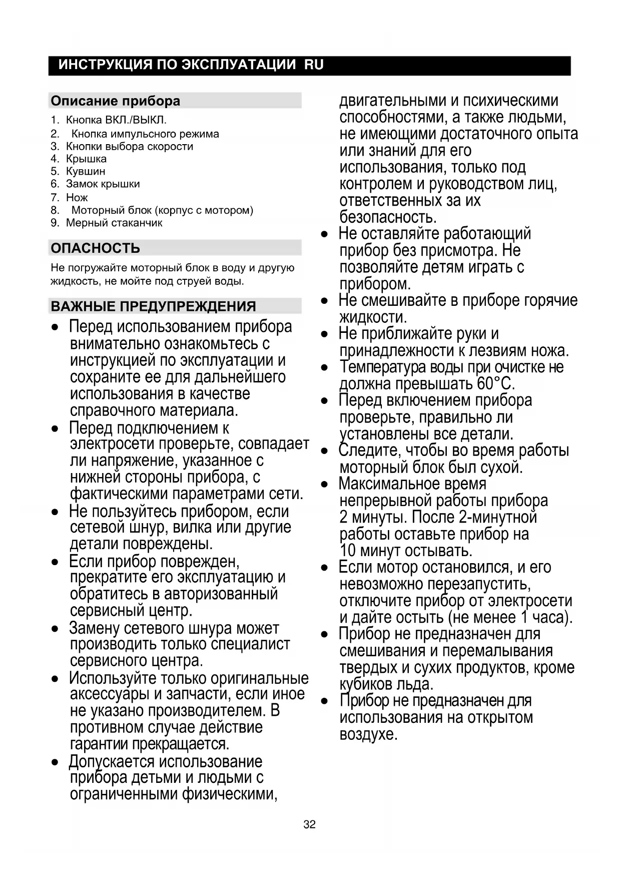 - Прибор не предназначен для смешивания и перемалывания твердых и сухих продуктов, кроме кубиков льда.
