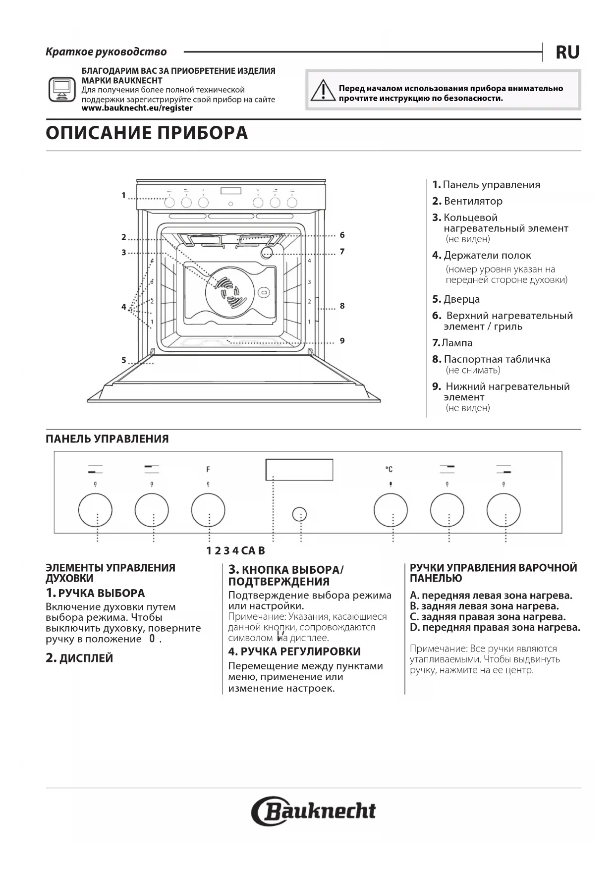 Краткое руководство БЛАГОДАРИМ ВАС ЗА ПРИОБРЕТЕНИЕ ИЗДЕЛИЯ МАРКИ BAUKNECHTДля получения более полной технической поддержки зарегистрируйте свой прибор на сайте www . bauknecht . eu / registerПеред началом использования прибора внимательно прочтите инструкцию по безопасности. ОПИСАНИЕ ПРИБОРА ПАНЕЛЬ УПРАВЛЕНИЯ