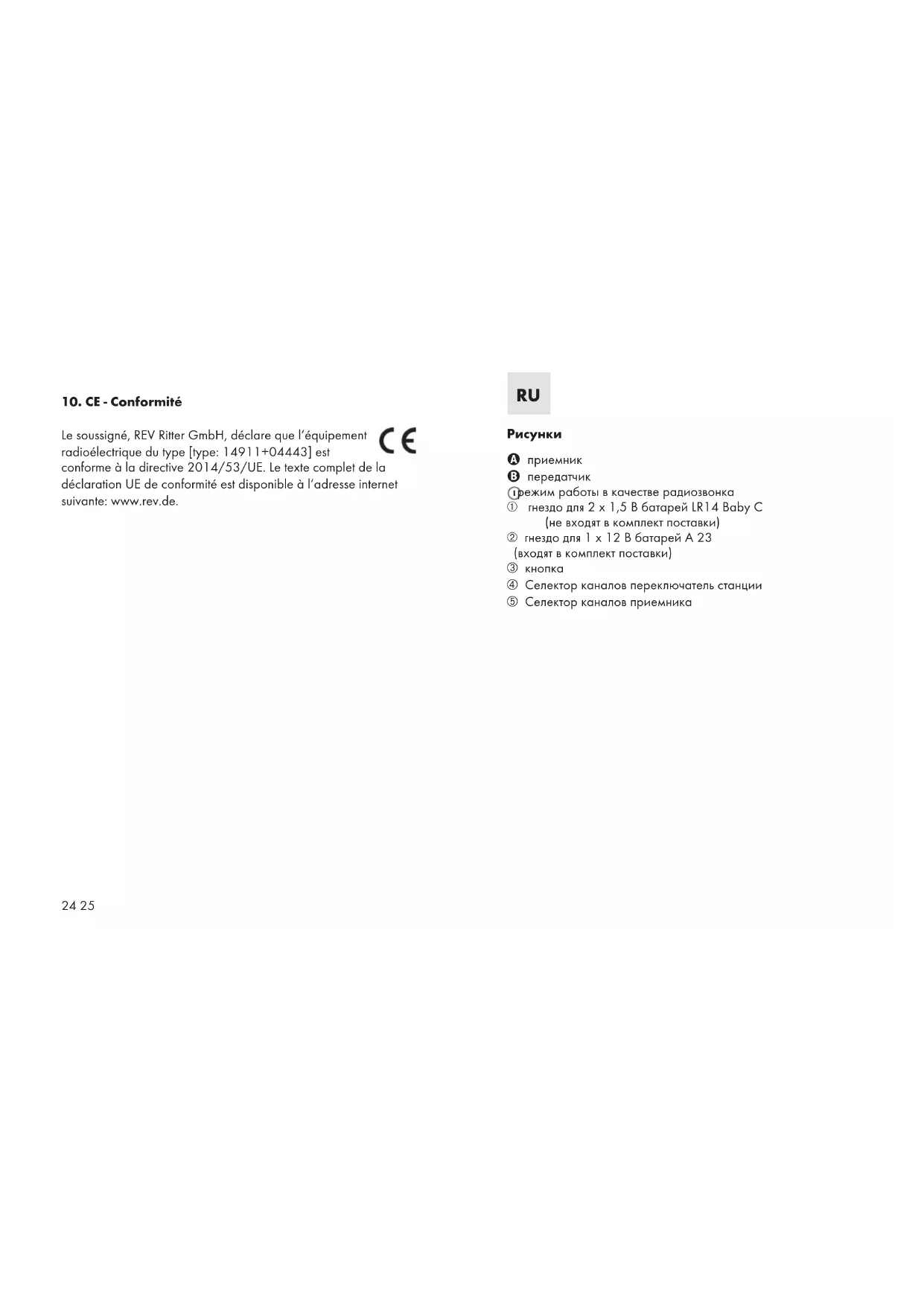 Le soussigné, REV Ritter GmbH, déclare que l‘équipement radioélectrique du type [type: 14911+04443] est conforme à la directive 2014/53/UE. Le texte complet de la déclaration UE de conformité est disponible à l‘adresse internet suivante: www.rev.de. ANL_04443_14903.indd 24-25 18.02.2019 14:28:3426 27 Уважаемые клиенты! Мы благодарим вас за покупку нашего радиозвонка. Он обладает огромными преимуществами: легкостью в обслуживании и простотой эксплуатации. Пожалуйста, перед использованием радиозвонка внимательно прочитайте инструкцию по эксплуатации.