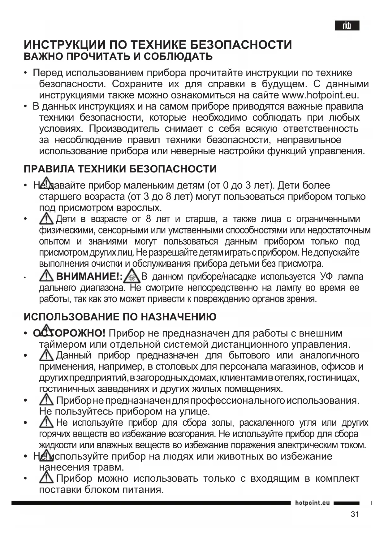 - Перед использованием прибора прочитайте инструкции по технике безопасности. Сохраните их для справки в будущем. С данными инструкциями также можно ознакомиться на сайте www.hotpoint.eu.