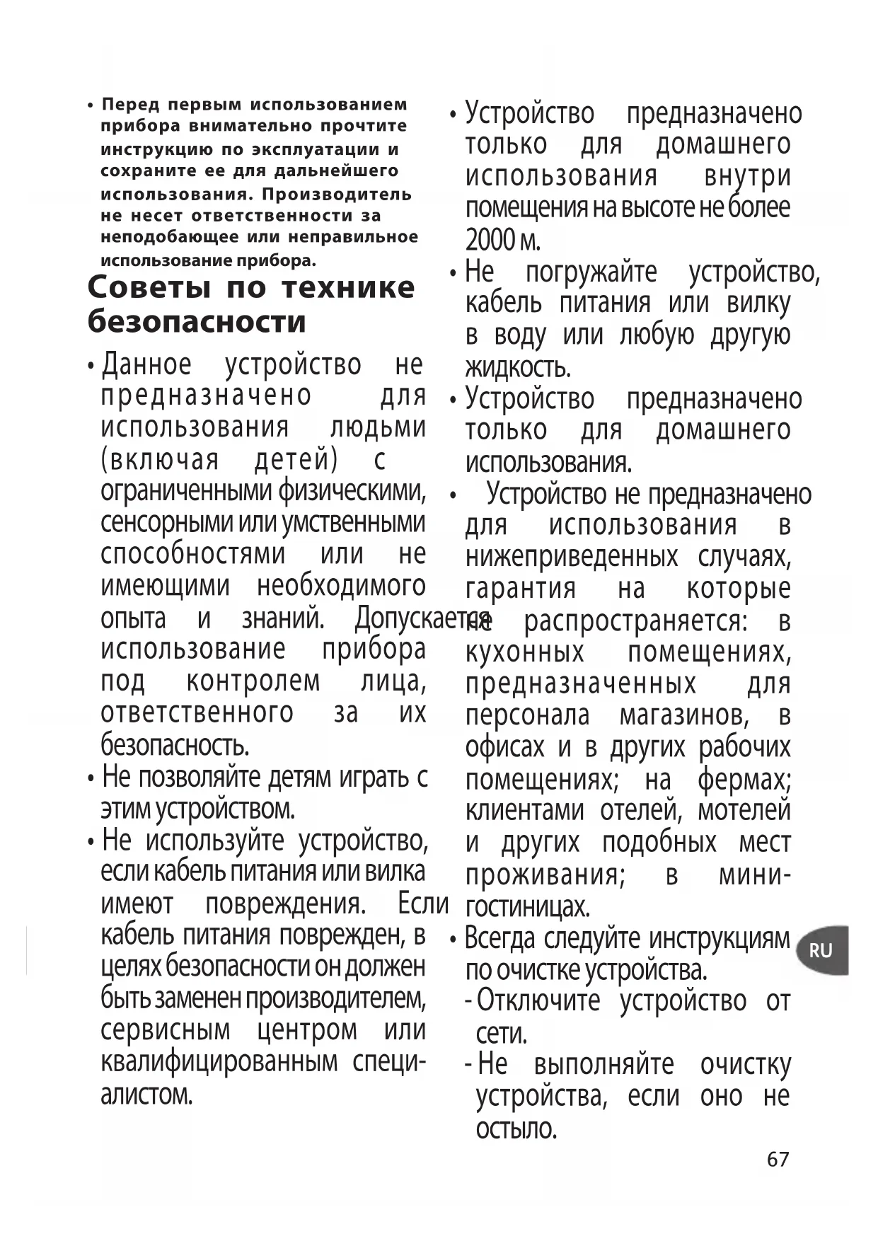 - Перед первым использованием прибора внимательно прочтите инструкцию по эксплуатации и сохраните ее для дальнейшего использования. Производитель не несет ответственности за неподобающее или неправильное использование прибора. Советы по технике безопасности