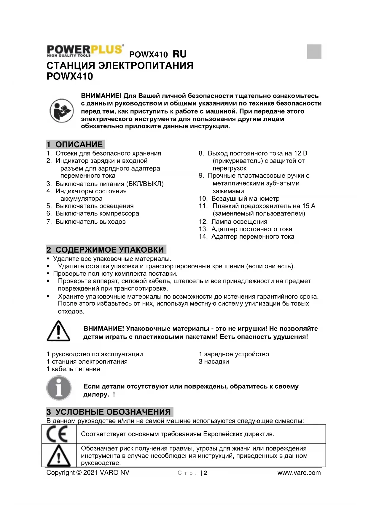 - 12 ДЕКЛАРАЦИЯ СООТВЕТСТВИЯ POWX410 RU Copyright © 2021 VARO NV С т р . | 2 www.varo.com СТАНЦИЯ ЭЛЕКТРОПИТАНИЯ POWX410 ВНИМАНИЕ! Для Вашей личной безопасности тщательно ознакомьтесь с данным руководством и общими указаниями по технике безопасности перед тем, как приступить к работе с машиной. При передаче этого электрического инструмента для пользования другим лицам обязательно приложите данные инструкции. 1 ОПИСАНИЕ p. 11