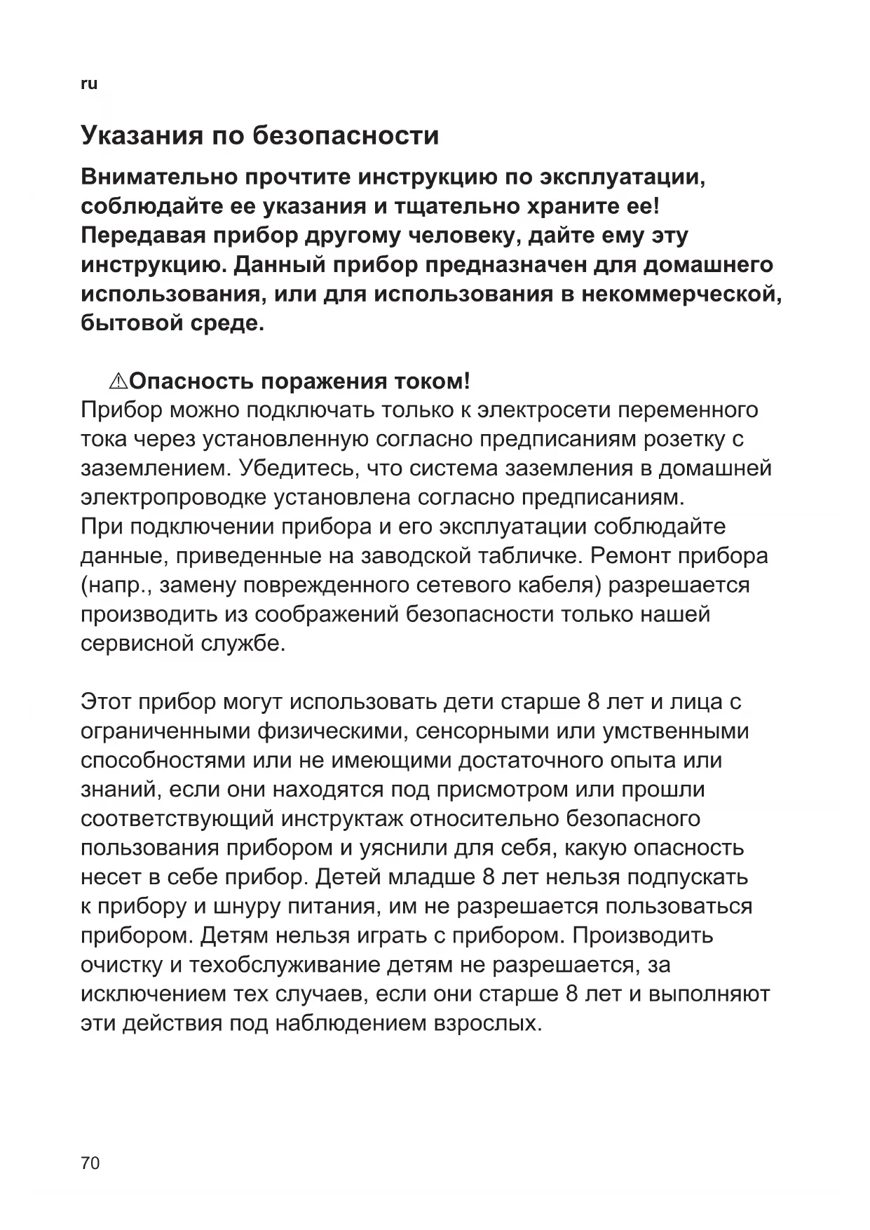 Указанияпобезопасности Внимательнопрочтитеинструкциюпоэксплуатации, соблюдайтеееуказанияитщательнохранитеее! Передаваяприбордругомучеловеку,дайтеемуэту инструкцию.Данныйприборпредназначендлядомашнего использования,илидляиспользованиявнекоммерческой, бытовойсреде. ¡ Опасностьпоражениятоком! Прибор можно подключать только к электросети переменного тока через установленную согласно предписаниям розетку с заземлением. Убедитесь, что система заземления в домашней электропроводке установлена согласно предписаниям. При подключении прибора и его эксплуатации соблюдайте данные, приведенные на заводской табличке. Ремонт прибора (напр., замену поврежденного сетевого кабеля) разрешается производить из соображений безопасности только нашей сервисной службе. Этот прибор могут использовать дети старше 8 лет и лица с ограниченными физическими, сенсорными или умственными способностями или не имеющими достаточного опыта или знаний, если они находятся под присмотром или прошли соответствующий инструктаж относительно безопасного пользования прибором и уяснили для себя, какую опасность несет в себе прибор. Детей младше 8 лет нельзя подпускать к прибору и шнуру питания, им не разрешается пользоваться прибором. Детям нельзя играть с прибором. Производить очистку и техобслуживание детям не разрешается, за исключением тех случаев, если они старше 8 лет и выполняют эти действия под наблюдением взрослых.71