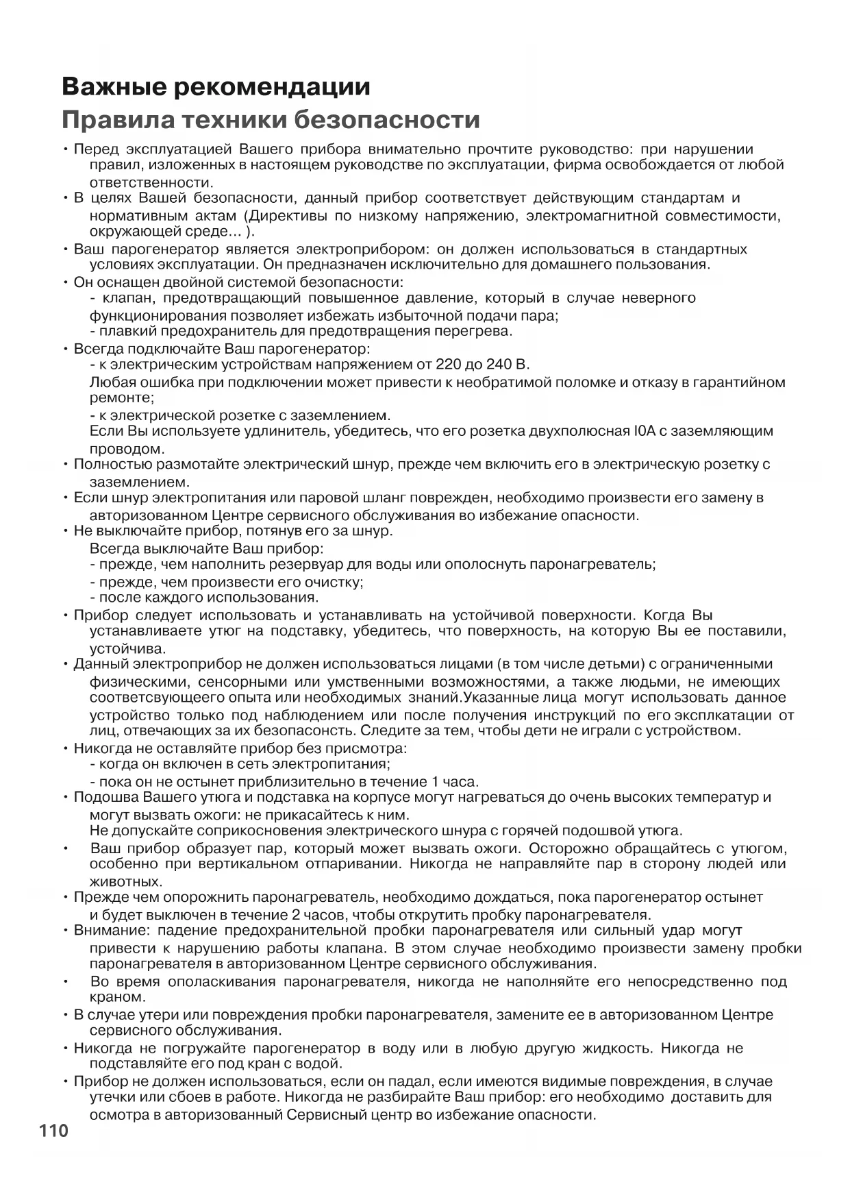 - Всегда подключайте Ваш парогенератор: - к электрическим устройствам напряжением от 220 до 240 В. Любая ошибка при подключении может привести к необратимой поломке и отказу в гарантийном