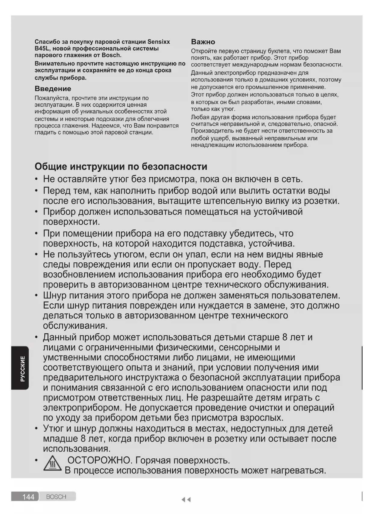 Даний посібник можна завантажити з україської веб-сторінки Bosch.144 B O S C H Спасибо за покупку паровой станции Sensixx B45l, новой профессиональной системы парового глажения от Bosch. Внимательно прочтите настоящую инструкцию по эксплуатации и сохраняйте ее до конца срока службы прибора.