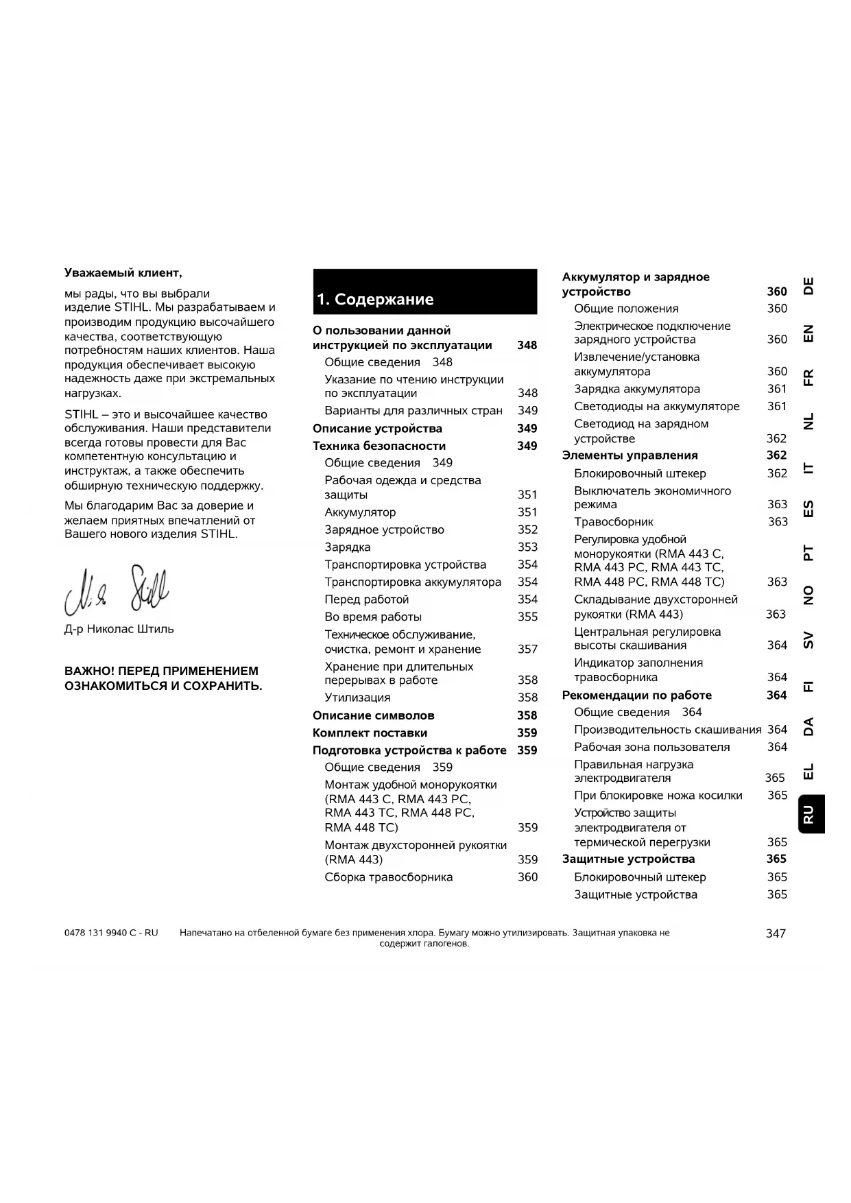 О пользовании данной инструкцией по эксплуатации 348 Общие сведения 348 Указание по чтению инструкции по эксплуатации 348 Варианты для различных стран 349 Описание устройства 349 Техника безопасности 349 Общие сведения 349 Рабочая одежда и средства защиты 351 Аккумулятор 351 Зарядное устройство 352 Зарядка 353 Транспортировка устройства 354 Транспортировка аккумулятора 354 Перед работой 354 Во время работы 355 Техническое обслуживание, очистка, ремонт и хранение 357 Хранение при длительных перерывах в работе 358 Утилизация 358 Описание символов 358 Комплект поставки 359 Подготовка устройства к работе 359 Общие сведения 359 Монтаж удобной монорукоятки (RMA 443 C, RMA 443 PC, RMA 443 TC, RMA 448 PC, RMA 448 TC) 359 Монтаж двухсторонней рукоятки (RMA 443) 359 Сборка травосборника 360 Аккумулятор и зарядное устройство 360 Общие положения 360 Электрическое подключение зарядного устройства 360 Извлечение/установка аккумулятора 360 Зарядка аккумулятора 361 Светодиоды на аккумуляторе 361 Светодиод на зарядном устройстве 362 Элементы управления 362 Блокировочный штекер 362 Выключатель экономичного режима 363 Травосборник 363 Регулировка удобной монорукоятки (RMA 443 C, RMA 443 PC, RMA 443 TC,
