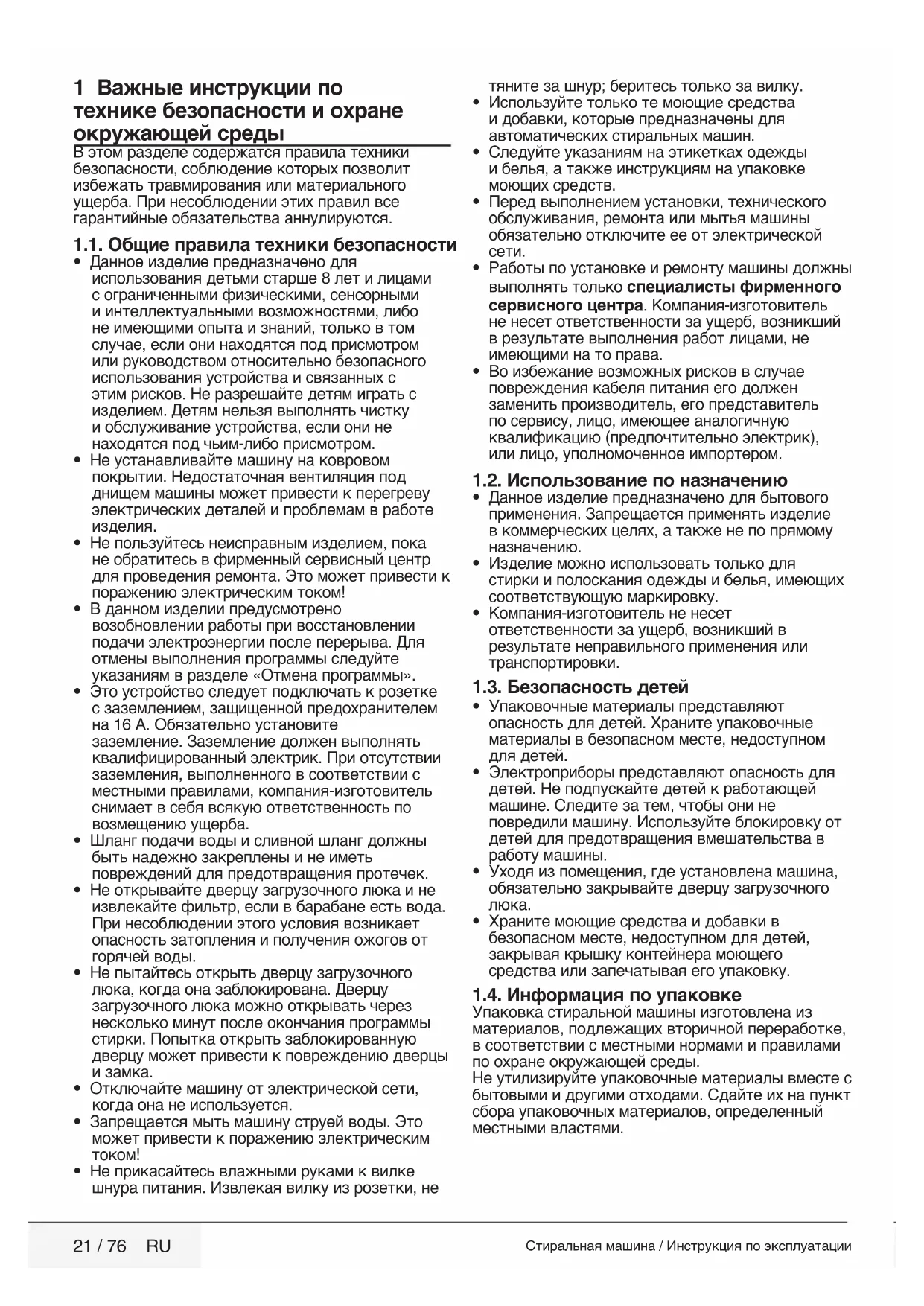 contactezvotrerevendeuroul'agentdeserviceagréé.N'essayezjamaisderéparerunappareilendommagéparvousmême.2820523276_RU / 16-01-13.(19:05) номер документа21 / 76 RU Стиральная машина / Инструкция по эксплуатации 1 Важные инструкции по технике безопасности и охране окружающей среды В этом разделе содержатся правила техники безопасности, соблюдение которых позволит избежать травмирования или материального ущерба. При несоблюдении этих правил все гарантийные обязательства аннулируются. 1.1. Общие правила техники безопасности