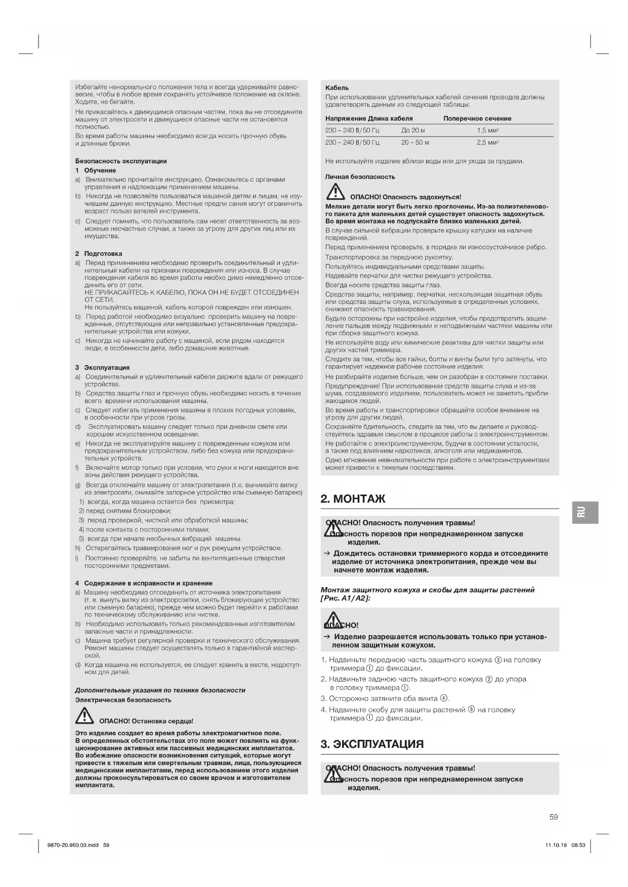 Не используйте изделие вблизи воды или для ухода за прудами. Личная безопасность ОПАСНО! Опасность задохнуться! Мелкие детали могут быть легко проглочены. Из-за полиэтиленово- го пакета для маленьких детей существует опасность задохнуться. Во время монтажа не подпускайте близко маленьких детей. В случае сильной вибрации проверьте крышку катушки на наличие повреждений. Перед применением проверьте, в порядке ли износоустойчивое ребро. Транспортировка за переднюю рукоятку. Пользуйтесь индивидуальными средствами защиты. Надевайте перчатки для чистки режущего устройства. Всегда носите средства защиты глаз. Средства защиты, например, перчатки, нескользящая защитная обувь или средства защиты слуха, используемые в определенных условиях, снижают опасность травмирования. Будьте осторожны при настройке изделия, чтобы предотвратить защем- ление пальцев между подвижными и неподвижными частями машины или при сборке защитного кожуха. Не используйте воду или химические реактивы для чистки защиты или других частей триммера. Следите за тем, чтобы все гайки, болты и винты были туго затянуты, что гарантирует надежное рабочее состояние изделия. Не разбирайте изделие больше, чем он разобран в состоянии поставки. Предупреждение! При использовании средств защиты слуха и из-за шума, создаваемого изделием, пользователь может не заметить прибли- жающихся людей. Во время работы и транспортировки обращайте особое внимание на угрозу для других людей. Сохраняйте бдительность, следите за тем, что вы делаете и руковод- ствуйтесь здравым смыслом в процессе работы с электроинструментом. Не работайте с электроинструментом, будучи в состоянии усталости, а также под влиянием наркотиков, алкоголя или медикаментов. Одно мгновение невнимательности при работе с электроинструментами может привести к тяжелым последствиям. 9870-20.960.03.indd 59 11.10.19 08:53RU