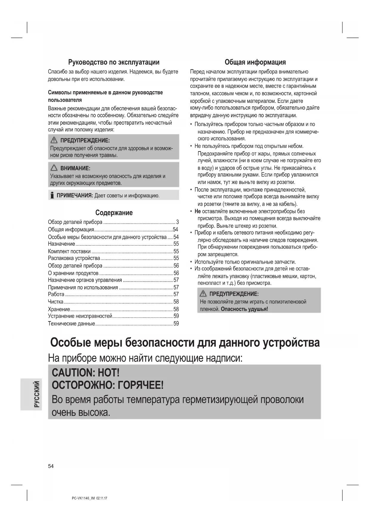 - Из соображений безопасности для детей не остав- ляйте лежать упаковку (пластиковые мешки, картон, пенопласт и т.д.) без присмотра. ПРЕДУПРЕЖДЕНИЕ: Не позволяйте детям играть с полиэтиленовой пленкой. Опасность удушья! Особые меры безопасности для данного устройства На приборе можно найти следующие надписи: CAUTION: HOT! ОСТОРОЖНО: ГОРЯЧЕЕ! Во время работы температура герметизирующей проволоки очень высока.PC-VK1146_IM 02.11.17