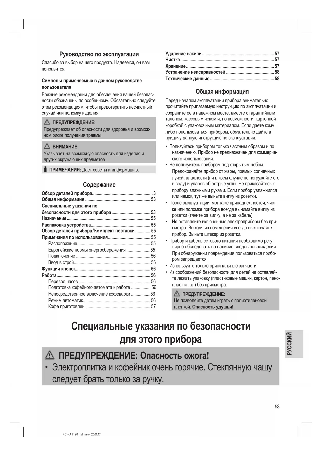 - Электроплитка и кофейник очень горячие. Стеклянную чашу следует брать только за ручку.54 PC-KA1120_IM_new 20.01.17 ПРЕДУПРЕЖДЕНИЕ: Опасность ожога!