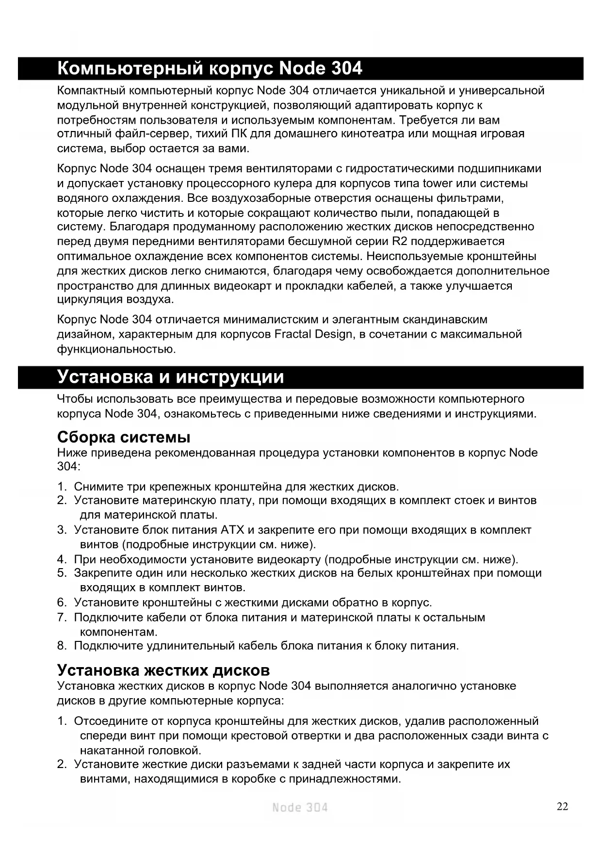 Компьютерный корпус Node 304 Компактный компьютерный корпус Node 304 отличается уникальной и универсальной модульной внутренней конструкцией, позволяющий адаптировать корпус к потребностям пользователя и используемым компонентам. Требуется ли вам отличный файл-сервер, тихий ПК для домашнего кинотеатра или мощная игровая система, выбор остается за вами. Корпус Node 304 оснащен тремя вентиляторами с гидростатическими подшипниками и допускает установку процессорного кулера для корпусов типа tower или системы водяного охлаждения. Все воздухозаборные отверстия оснащены фильтрами, которые легко чистить и которые сокращают количество пыли, попадающей в систему. Благодаря продуманному расположению жестких дисков непосредственно перед двумя передними вентиляторами бесшумной серии R2 поддерживается оптимальное охлаждение всех компонентов системы. Неиспользуемые кронштейны для жестких дисков легко снимаются, благодаря чему освобождается дополнительное пространство для длинных видеокарт и прокладки кабелей, а также улучшается циркуляция воздуха. Корпус Node 304 отличается минималистским и элегантным скандинавским дизайном, характерным для корпусов Fractal Design, в сочетании с максимальной функциональностью. Установка и инструкции Чтобы использовать все преимущества и передовые возможности компьютерного корпуса Node 304, ознакомьтесь с приведенными ниже сведениями и инструкциями. Сборка системы Ниже приведена рекомендованная процедура установки компонентов в корпус Node 304: