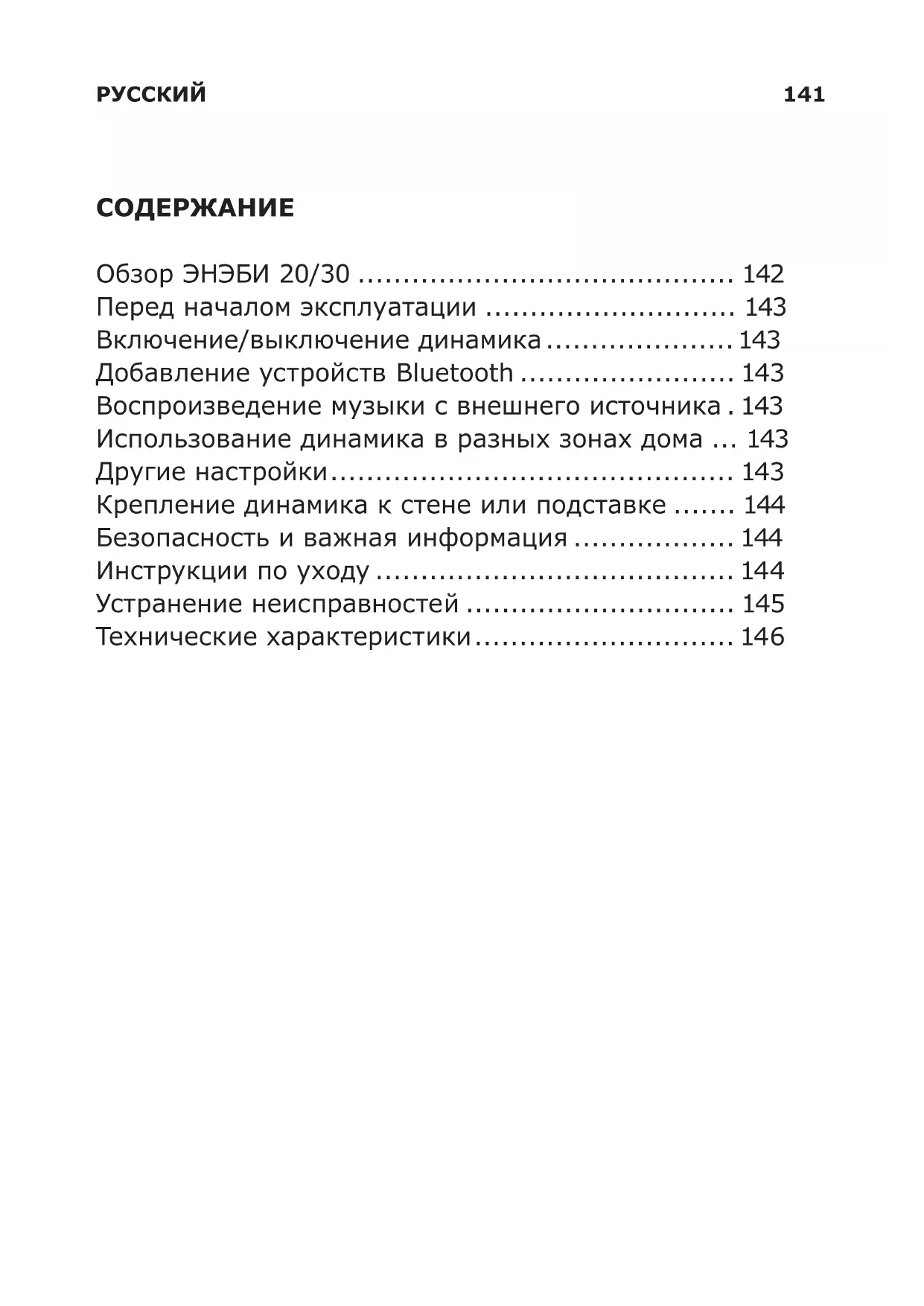 использовать Bluetooth: Убедитесь, что разъем 3,5 мм не подключен к аудио-входу (AUDIO IN) на задней панели. Убедитесь, что ваш телефон, планшет или другое медиа- устройство поддерживает Bluetooth. Убедитесь в подключении устройства ЭНЭБИ 20/30. Убедитесь, что ваш телефон, планшет или другое медиа- устройство сопряжено, а также, что включена функция Bluetooth. Убедитесь, что другие устройства Bluetooth в помещении не сопряжены. При наличии сопряженного устройства отключите в нем функцию Bluetooth. Низкое качество звука при проигрывании через Bluetooth: При низком качестве приема сигнала Bluetooth поместите устройство ближе к динамику или удалите препятствия между устройством и динамиком. Внимание: прием сигнала Bluetooth нормально осуществляется на расстоянии 6–8 м при отсутствии препятствий. Если между двумя устройствами есть стены или предметы мебели, уровень сигнала Bluetooth может быть снижен. Если устройство находится в кармане одежды или сумке, уровень сигнала Bluetooth также может быть снижен. Низкое качество звука при проигрывании через аудио-вход (AUDIO IN): Убедитесь, что звук телефона, планшета или другого устройства не установлен на максимальный уровень. В противном случае убавьте звук. Устранение неполадок146 Технические характеристики Наименование ЭНЕБИ 20 ЭНЕБИ 30