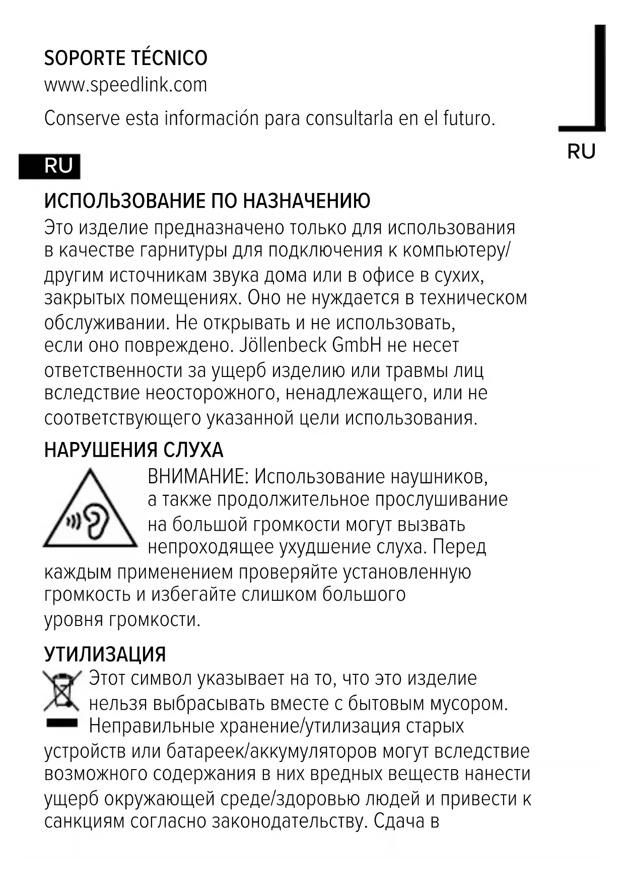 Этот символ указывает на то, что это изделие нельзя выбрасывать вместе с бытовым мусором. Неправильные хранение/утилизация старых устройств или батареек/аккумуляторов могут вследствие возможного содержания в них вредных веществ нанести ущерб окружающей среде/здоровью людей и привести к санкциям согласно законодательству. Сдача вспециальных официальных пунктах сбора является бесплатной и предписана законодательством, это обеспечивает правильную утилизацию или переработку/повторное использование и таким образом вносит вклад в защиту окружающей среды. Справку можно получить в официальных инстанциях, пунктах утилизации или в специализированных магазинах. Крупные магазины (торговая площадь для электроприборов ≥ 400м2) принимают небольшие устройства (все размеры < 25см) бесплатно, другие только при покупке равноценных изделий. Элементы питания/аккумуляторы по возможности вынуть. ИНФОРМАЦИЯ О СООТВЕТСТВИИ Из-за влияния сильных статических, электрических или высокочастотных полей (излучение радиоустановок, мобильных телефонов, микроволновых печей) могут возникнуть радиопомехи. В этом случае нужно увеличить расстояние от источников помех. ТЕХНИЧЕСКАЯ ПОДДЕРЖКА www.speedlink.com Сохраните эту информацию для использования в будущем.
