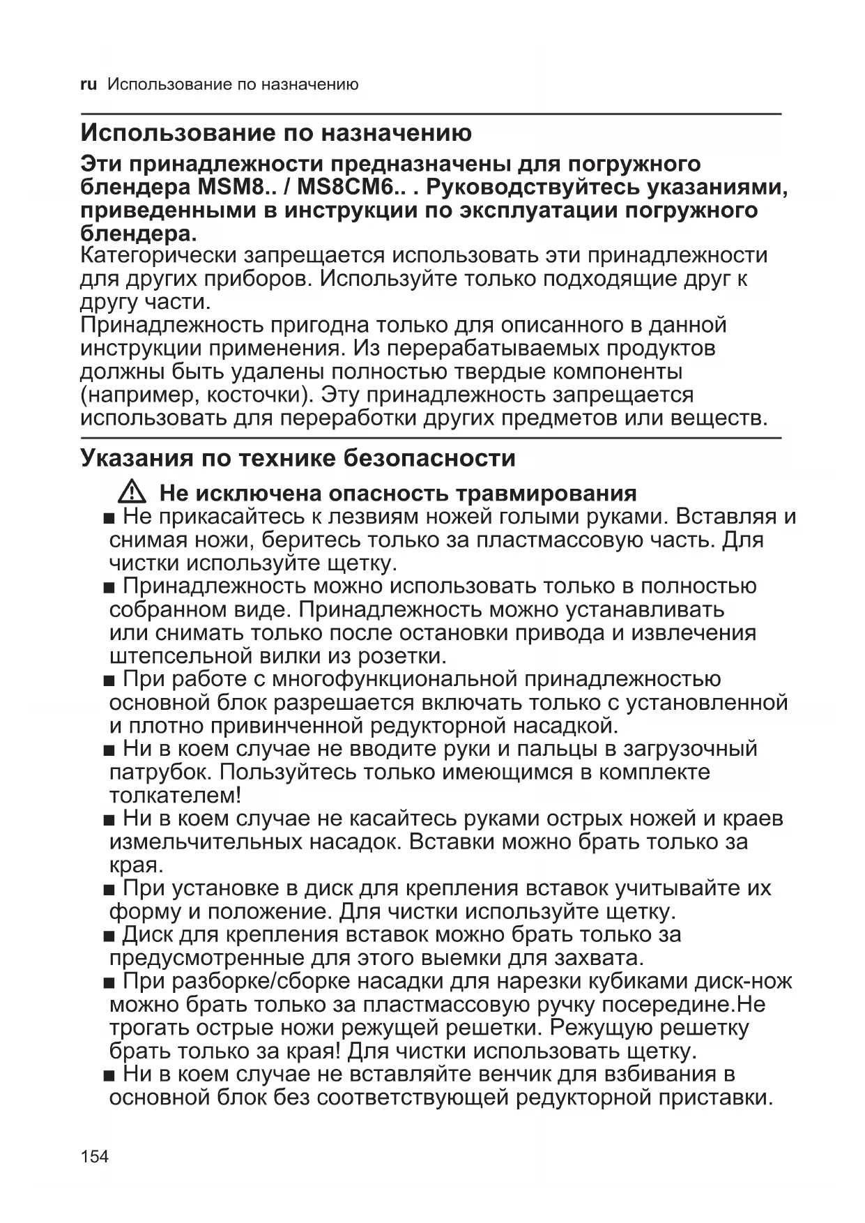 Категорически запрещается использовать эти принадлежности для других приборов. Используйте только подходящие друг к другу части. Принадлежность пригодна только для описанного в данной инструкции применения. Из перерабатываемых продуктов должны быть удалены полностью твердые компоненты (например, косточки). Эту принадлежность запрещается использовать для переработки других предметов или веществ. Указания по технике безопасности W Не исключена опасность травмирования ■ Не прикасайтесь к лезвиям ножей голыми руками. Вставляя и снимая ножи, беритесь только за пластмассовую часть. Для чистки используйте щетку. ■ Принадлежность можно использовать только в полностью собранном виде. Принадлежность можно устанавливать или снимать только после остановки привода и извлечения штепсельной вилки из розетки. ■ При работе с многофункциональной принадлежностью основной блок разрешается включать только с установленной и плотно привинченной редукторной насадкой. ■ Ни в коем случае не вводите руки и пальцы в загрузочный патрубок. Пользуйтесь только имеющимся в комплекте толкателем! ■ Hи в коем случаe не касайтесь руками острых ножей и краев измельчительных насадок. Вставки можно брать только за