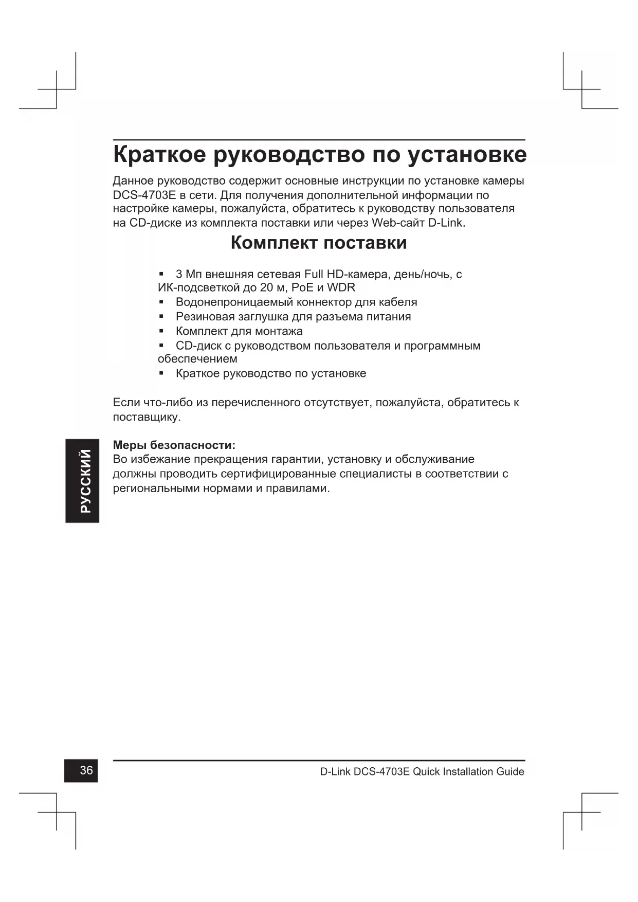 Краткое руководство по установке Данное руководство содержит основные инструкции по установке камеры DCS-4703E в сети. Для получения дополнительной информации по настройке камеры, пожалуйста, обратитесь к руководству пользователя на CD-диске из комплекта поставки или через Web-сайт D-Link. Комплект поставки 3 Мп внешняя сетевая Full HD-камера, день/ночь, с ИК-подсветкой до 20 м, PoE и WDR Водонепроницаемый коннектор для кабеля Резиновая заглушка для разъема питания Комплект для монтажа CD-диск с руководством пользователя и программным обеспечением Краткое руководство по установке Если что-либо из перечисленного отсутствует, пожалуйста, обратитесь к поставщику. Меры безопасности: Во избежание прекращения гарантии, установку и обслуживание должны проводить сертифицированные специалисты в соответствии с региональными нормами и правилами.37