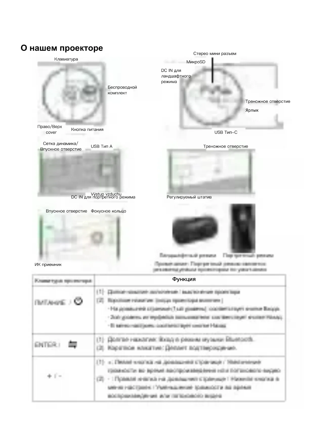 Меры предосторожностиО нашем проекторе Долгое нажатие: включение / выключение проектора Короткое нажатие: (ког да проектора включен ) - На домашней странице (1ый уровень): соответств у е т кнопке Входа. - 2ой уровень интерфейса пользов ате ля: соо тв е т ст в ует кнопке Назад. - В меню настроек: соответ ст в уе т кнопке Назад (1) (2) (1) (2) (1) (2) Долгое нажатие: Вход в режим музыки Bluetooth. Короткое нажатие: Делает подтверждение. +: Левая кнопка на домашней странице / Увеличение громкости во время воспроизведения или потокового видео - : Правая кнопка на домашней странице / Нижняя кнопка в меню настроек / Уменьшение громкости во время воспроизведения или потокового видео