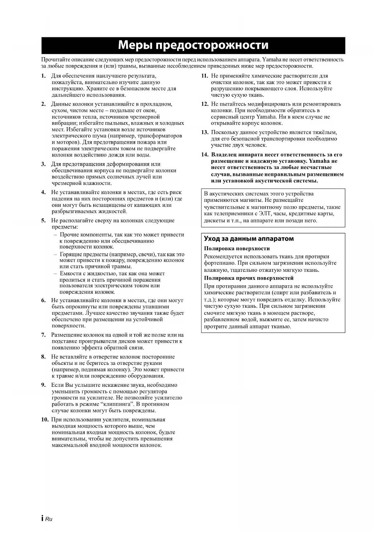 ответственность за любые несчастные случаи, вызванные неправильным размещением или установкой акустической системы. Меры предосторожности В акустических системах этого устройства применяются магниты. Не размещайте чувствительные к магнитному полю предметы, такие как телеприемники с ЭЛТ, часы, кредитные карты, дискеты и т.п., на аппарате или позади него. Уход за данным аппаратом Полировка поверхности Рекомендуется использовать ткань для протирки фортепиано. При сильном загрязнении используйте влажную, тщательно отжатую мягкую ткань. Полировка прочих поверхностей При протирании данного аппарата не используйте химические растворители (спирт или разбавитель и т.д.); которые могут повредить отделку. Используйте чистую сухую ткань. При сильном загрязнении смочите мягкую ткань в моющем растворе, разбавленном водой, выжмите ее, затем начисто протрите данный аппарат тканью.1 Ru