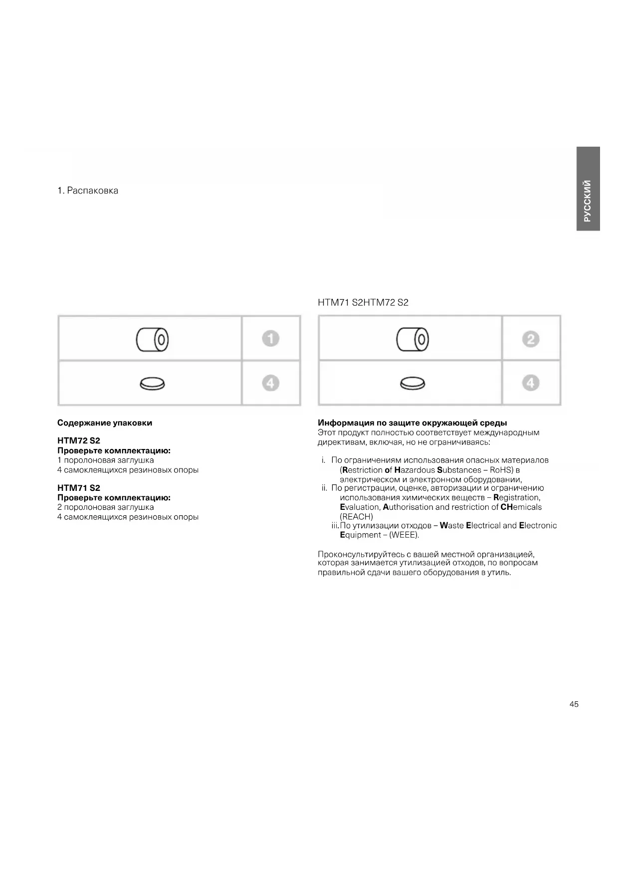 Содержание упаковки HTM72S2 Проверьте комплектацию: 1 поролоновая заглушка 4 самоклеящихся резиновых опоры HTM71S2 Проверьте комплектацию: 2 поролоновая заглушка 4 самоклеящихся резиновых опоры Информация по защите окружающей среды Этот продукт полностью соответствует международным директивам, включая, но не ограничиваясь: