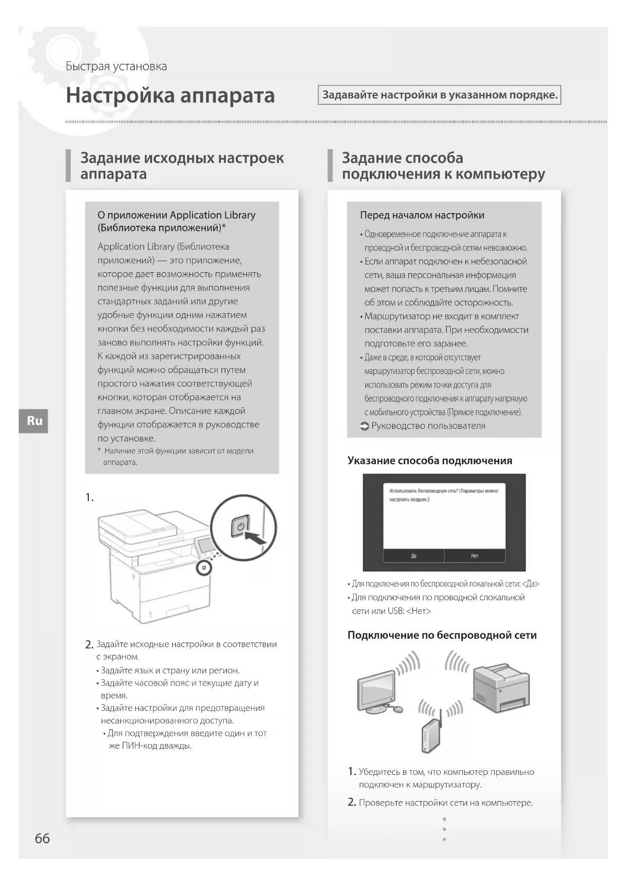 Задайте исходные настройки всоответствии сэкраном.• Задайте язык и страну или регион.• Задайте часовой пояс и текущие дату и время.• Задайте настройки для предотвращения несанкционированного доступа.• Для подтверждения введите один и тот же ПИН-код дважды.Перед началом настройки Одновременное подключение аппарата к проводной и беспроводной сетям невозможно. Если аппарат подключен к небезопасной сети, ваша персональная информация может попасть к третьим лицам. Помните об этом и соблюдайте осторожность.• Маршрутизатор не входит в комплект поставки аппарата. При необходимости подготовьте его заранее. Даже в среде, в которой отсутствует маршрутизатор беспроводной сети, можно использовать режим точки доступа для беспроводного подключения к аппарату напрямую с мобильного устройства (Прямое подключение). Руководство пользователяУказание способа подключения Для подключения по беспроводной локальной сети: <Да>• Для подключения по проводной слокальной сети или USB: <Нет>Подключение по беспроводной сети Убедитесь втом, что компьютер правильно подключен кмаршрутизатору. Проверьте настройки сети на компьютере.