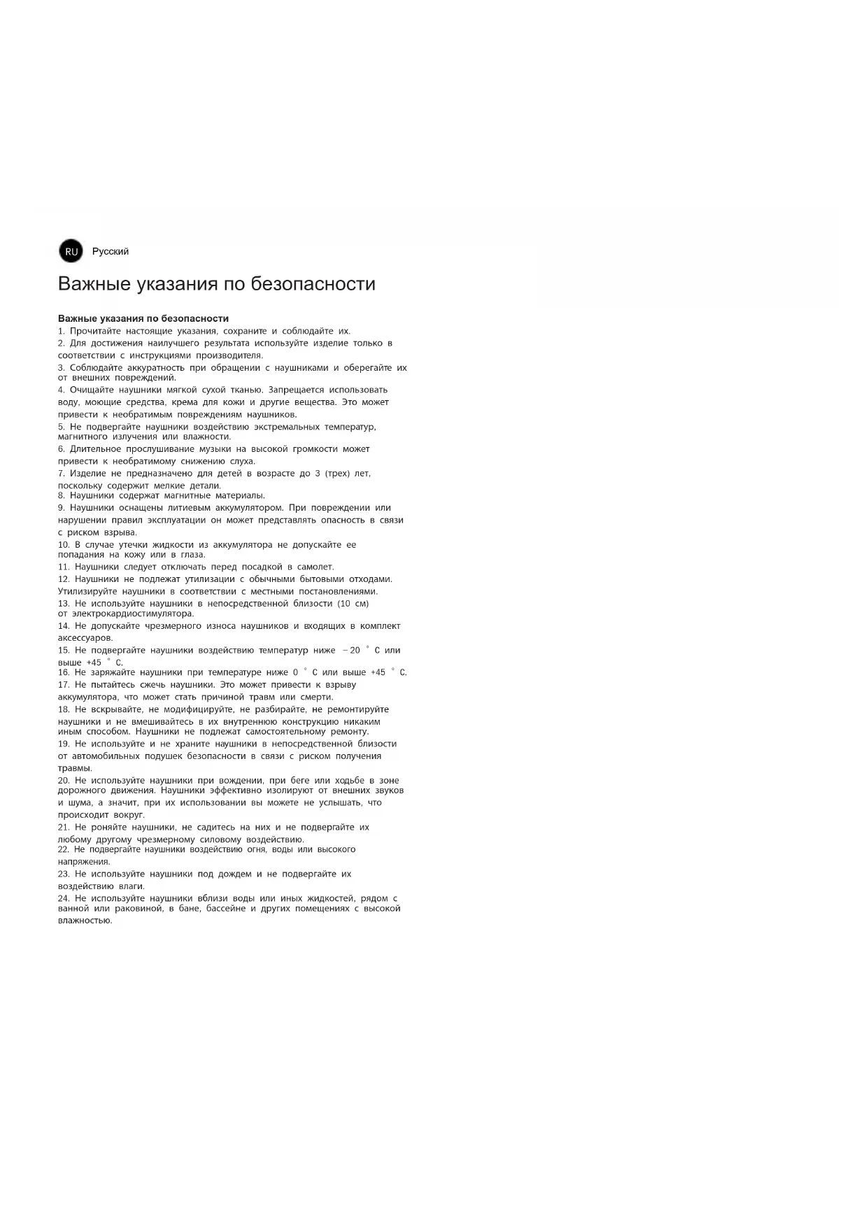 24. Не используйте наушники вблизи воды или иных жидкостей, рядом с