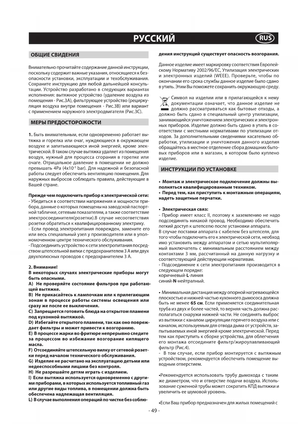 INSTRUCŢIUNILOR DE MAI SUS. - 48 -ОБЩИЕ СВИДЕНИЯ Внимательно прочитайте содержание данной инструкции, поскольку содержит важные указания, относящиеся к без- опасности установки, эксплуатации и техобслуживания. Сохраните инструкцию для любой дальнейшей консуль- тации. Устройство разработано в следующих вариантах исполнения: вытяжное устройство (удаление воздуха из помещения - Рис.3A), фильтрующее устройство (рецирку- ляция воздуха внутри помещения - Рис.3B) или вариант с применением наружного электродвигателя (Рис.3C). МЕРЫ ПРЕДОСТОРОЖОСТИ