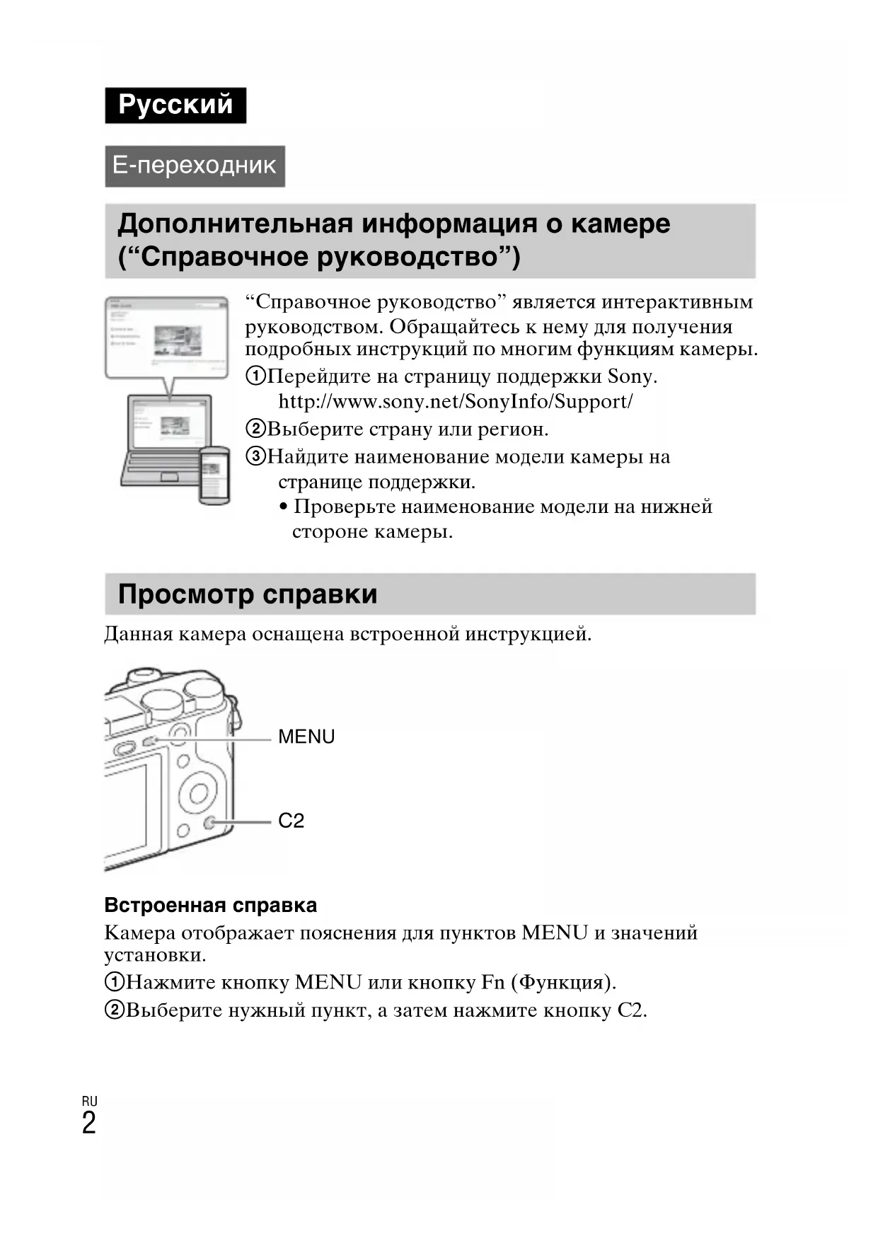 E-переходник Дополнительная информация о камере (“Справочное руководство”) “Справочное руководство” является интерактивным руководством. Обращайтесь к нему для получения подробных инструкций по многим функциям камеры. 1 Перейдите на страницу поддержки Sony. http://www.sony.net/SonyInfo/Support/ 2 Выберите страну или регион. 3 Найдите наименование модели камеры на странице поддержки.