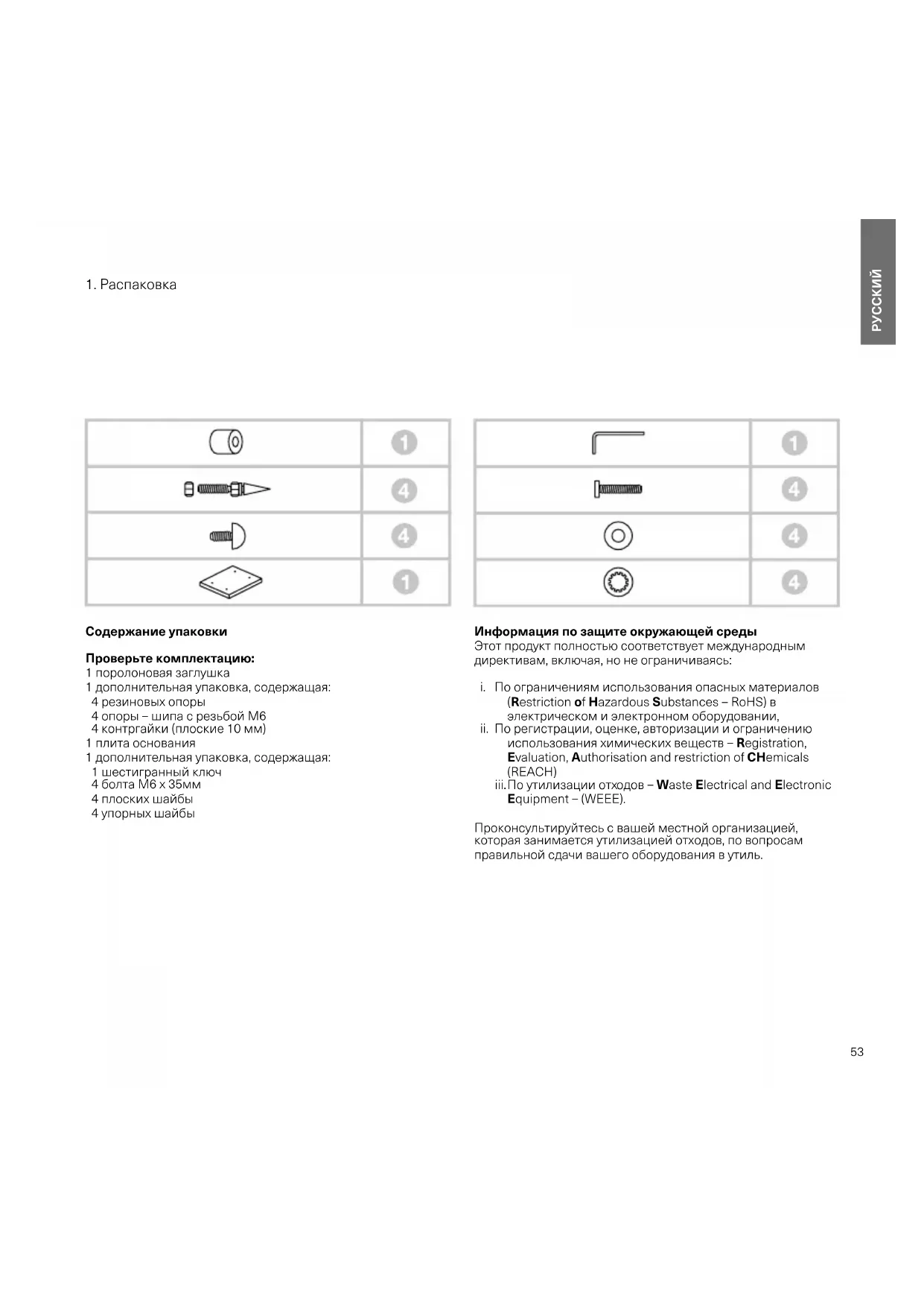 Содержание упаковки Проверьте комплектацию: 1 поролоновая заглушка 1 дополнительная упаковка, содержащая: 4 резиновых опоры 4 опоры – шипа с резьбой М6 4 контргайки (плоские 10 мм) 1 плита основания 1 дополнительная упаковка, содержащая: 1 шестигранный ключ 4 болта M6 x 35мм 4 плоских шайбы 4 упорных шайбы Информация по защите окружающей среды Этот продукт полностью соответствует международным директивам, включая, но не ограничиваясь: