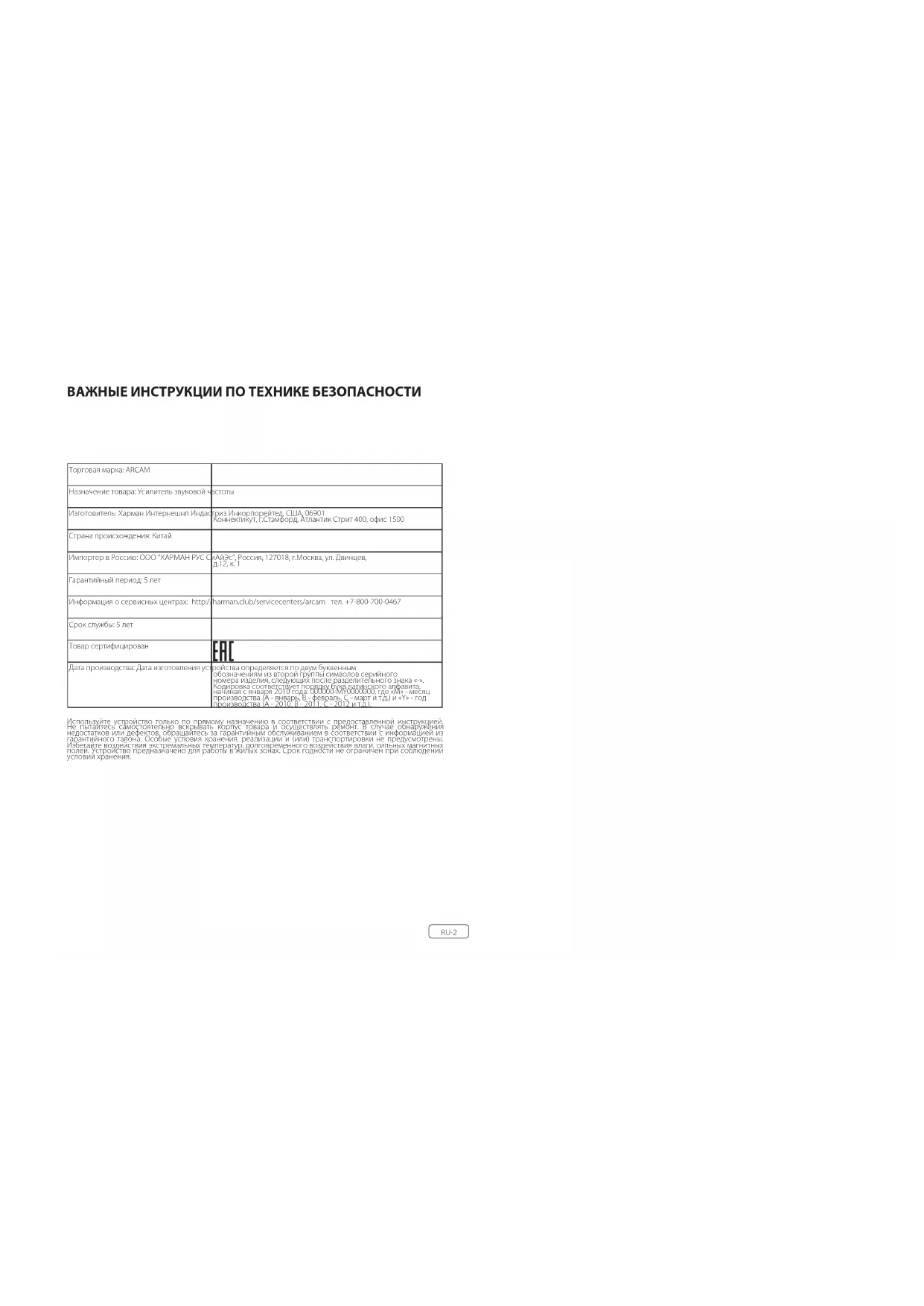 УСИЛИТЕЛЬ МОЩНОСТИ PA720 / PA240 / PA410RU-2 ВАЖНЫЕ ИНСТРУКЦИИ ПО ТЕХНИКЕ БЕЗОПАСНОСТИ Торговая марка: ARCAM Назначение товара: Усилитель звуковой частоты Изготовитель: Харман Интернешнл Индастриз Инкорпорейтед, США, 06901 Коннектикут, г.Стэмфорд, Атлантик Стрит 400, офис 1500 Страна происхождения: Китай Импортер в Россию: OOO “ХАРМАН РУС СиАйЭс“, Россия, 127018, г.Москва, ул. Двинцев, д.12, к. 1 Гарантийный период: 5 лет Информация о сервисных центрах: http://harman.club/servicecenters/arcam тел. +7-800-700-0467 Срок службы: 5 лет Товар сертифицирован Дата производства: Дата изготовления устройства определяется по двум буквенным обозначениям из второй группы символов серийного номера изделия, следующих после разделительного знака «-». Кодировка соответствует порядку букв латинского алфавита, начиная с января 2010 года: 000000-MY0000000, где «M» - месяц производства (А - январь, B - февраль, C - март и т.д.) и «Y» - год производства (A - 2010, B - 2011, C - 2012 и т.д.). Используйте устройство только по прямому назначению в соответствии с предоставленной инструкцией. Не пытайтесь самостоятельно вскрывать корпус товара и осуществлять ремонт. В случае обнаружения недостатков или дефектов, обращайтесь за гарантийным обслуживанием в соответствии с информацией из гарантийного талона. Особые условия хранения, реализации и (или) транспортировки не предусмотрены. Избегайте воздействия экстремальных температур, долговременного воздействия влаги, сильных магнитных полей. Устройство предназначено для работы в жилых зонах. Срок годности не ограничен при соблюдении условий хранения.RU-3