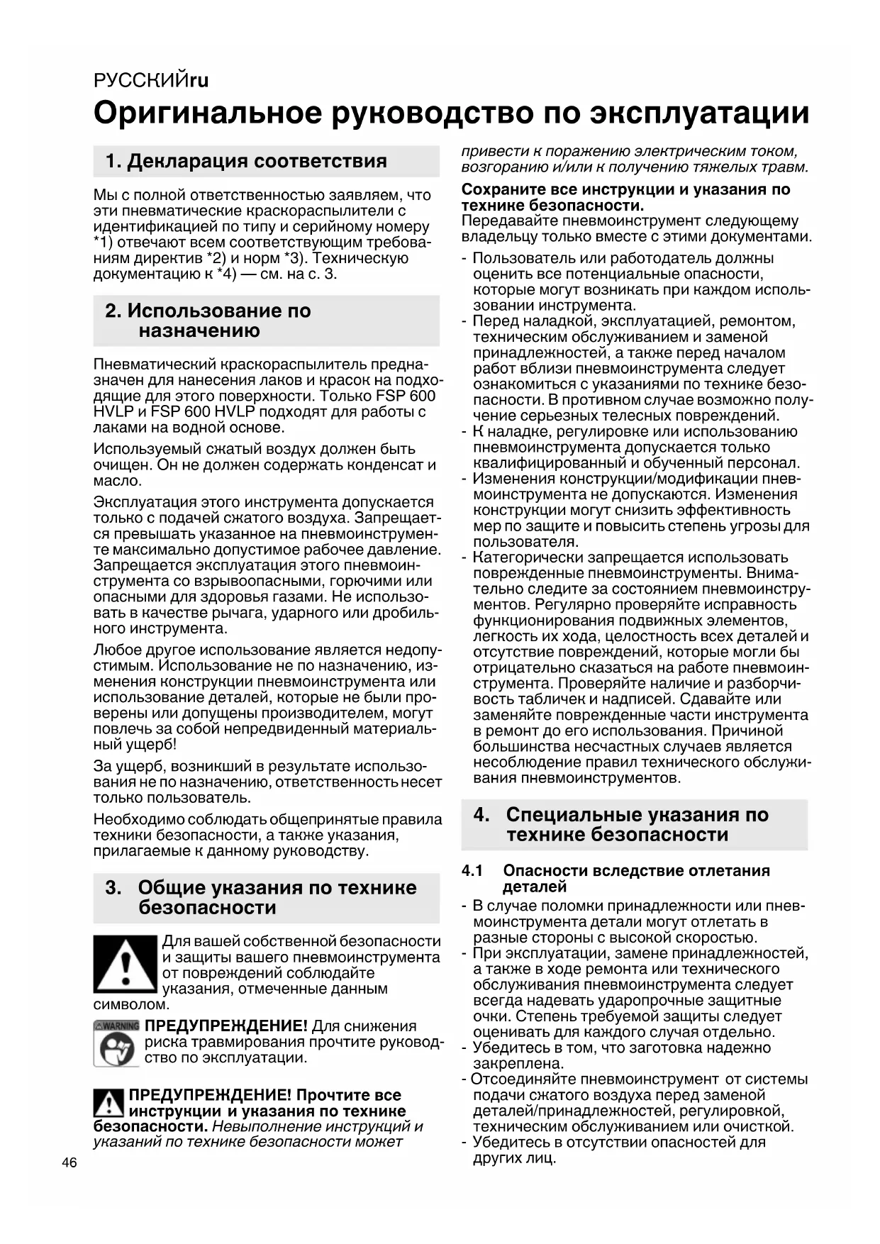 Оригинальное руководство по эксплуатации Мы с полной ответственностью заявляем, что эти пневматические краскораспылители с идентификацией по типу и серийному номеру *1) отвечают всем соответствующим требова- ниям директив *2) и норм *3). Техническую документацию к *4) — см. на с. 3. Пневматический краскораспылитель предна- значен для нанесения лаков и красок на подхо- дящие для этого поверхности. Только FSP 600 HVLP и FSP 600 HVLP подходят для работы