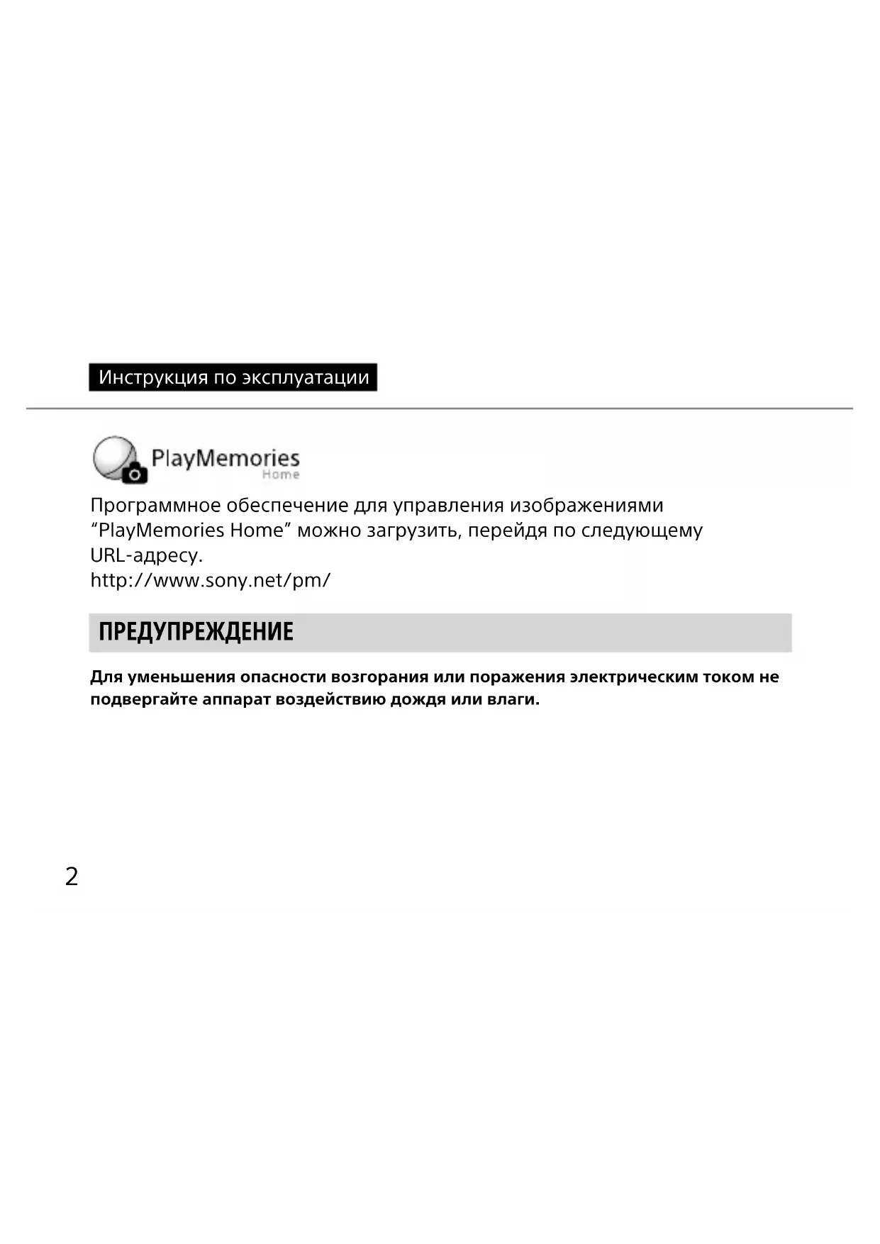 Программное обеспечение для управления изображениями “PlayMemories Home” можно загрузить, перейдя по следующему URL-адресу. http://www.sony.net/pm/ ПРЕДУПРЕЖДЕНИЕ Для уменьшения опасности возгорания или поражения электрическим током не подвергайте аппарат воздействию дождя или влаги. Инструкция по эксплуатацииRU