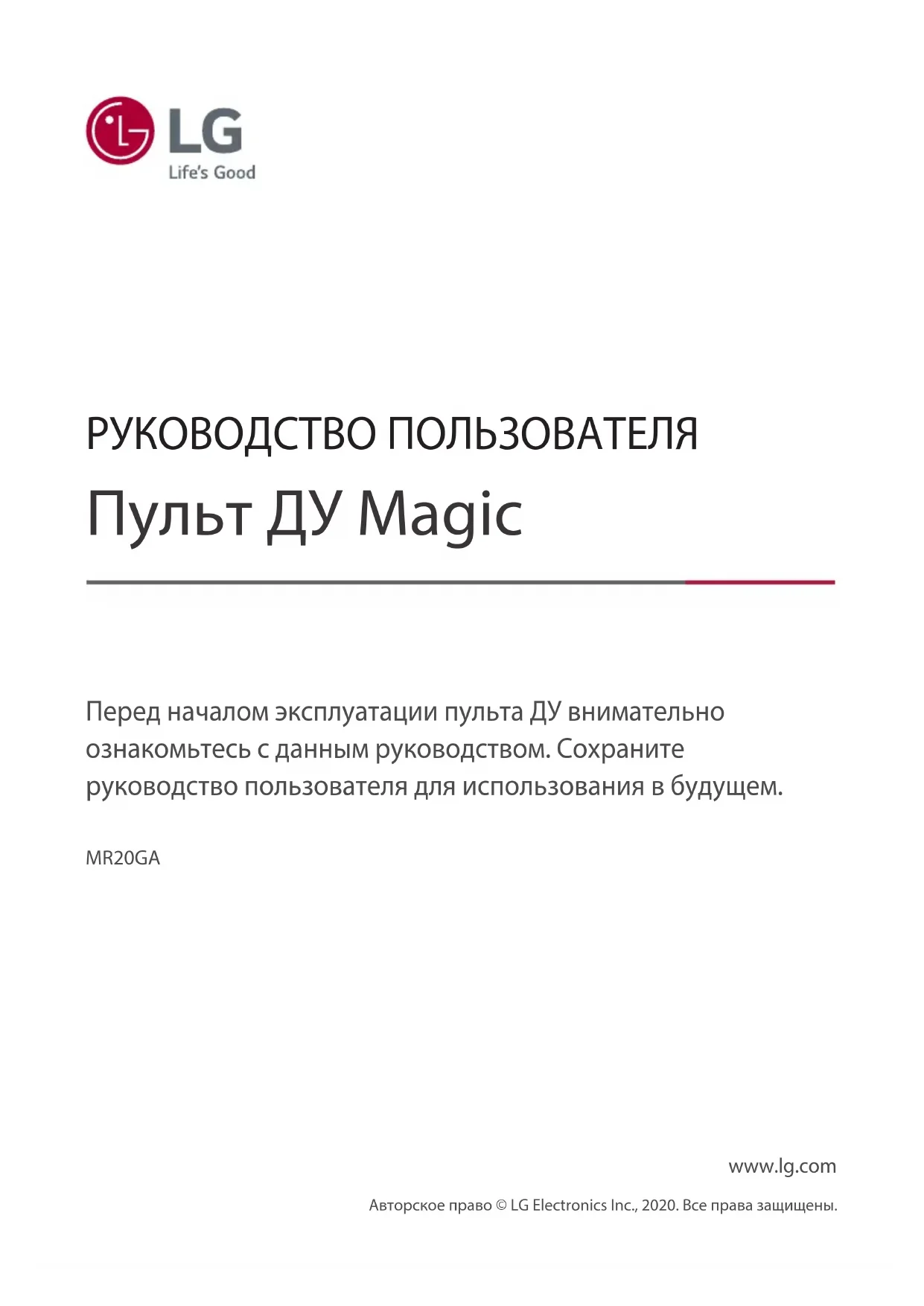 Перед началом эксплуатации пульта ДУ внимательно ознакомьтесь с данным руководством. Сохраните руководство пользователя для использования в будущем. Пульт ДУ Magic РУКОВОДСТВО ПОЛЬЗОВАТЕЛЯ www.lg.com Авторское право © LG Electronics Inc., 2020. Все права защищены.2