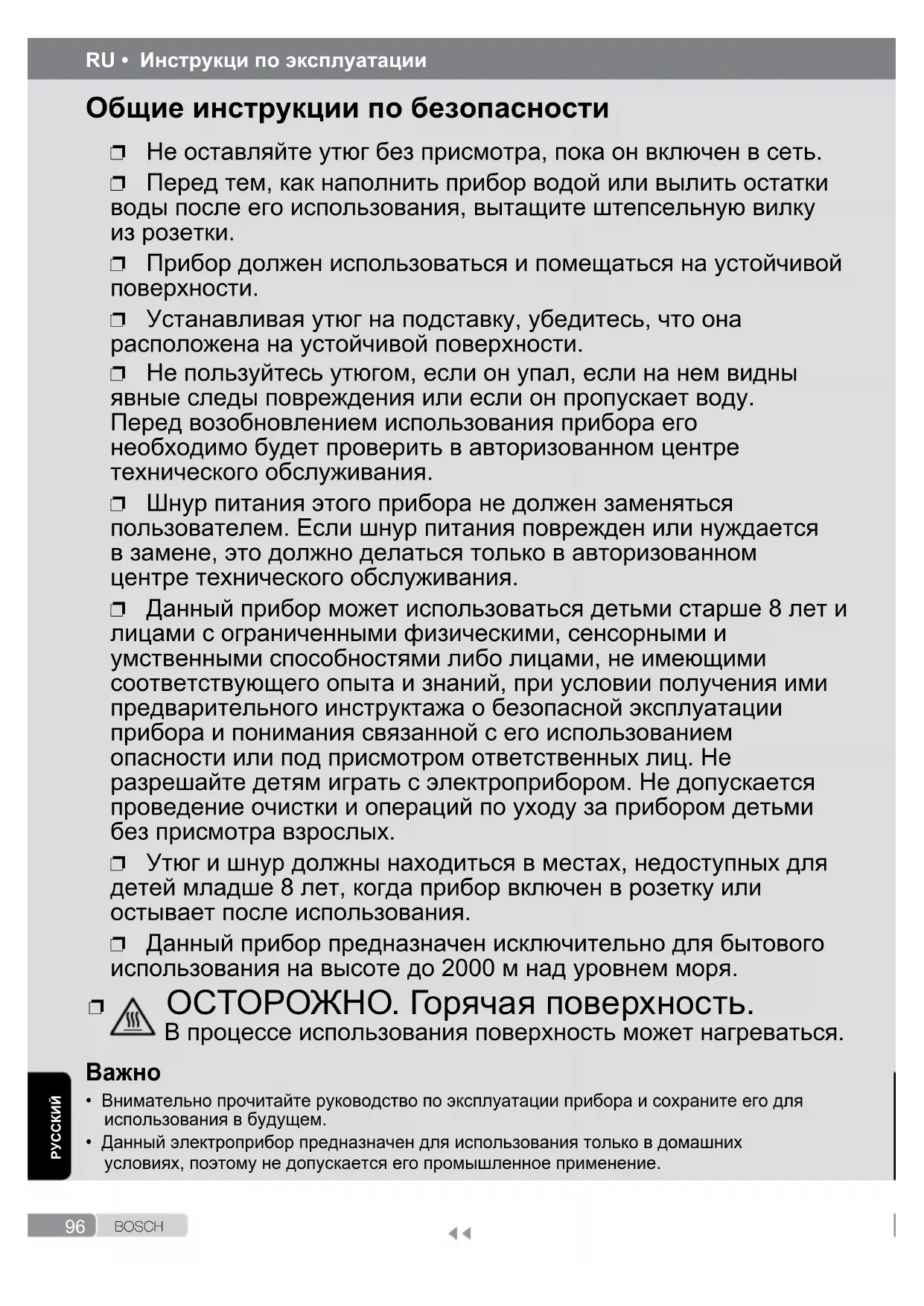 - Внимательно прочитайте руководство по эксплуатации прибора и сохраните его для использования в будущем. • Данный электроприбор предназначен для использования только в домашних условиях, поэтому не допускается его промышленное применение. Общие инструкции по безопасности ❐ Не оставляйте утюг без присмотра, пока он включен в сеть. ❐ Перед тем, как наполнить прибор водой или вылить остатки воды после его использования, вытащите штепсельную вилку из розетки. ❐ Прибор должен использоваться и помещаться на устойчивой поверхности. ❐ Устанавливая утюг на подставку, убедитесь, что она расположена на устойчивой поверхности. ❐ Не пользуйтесь утюгом, если он упал, если на нем видны явные следы повреждения или если он пропускает воду. Перед возобновлением использования прибора его необходимо будет проверить в авторизованном центре технического обслуживания. ❐ Шнур питания этого прибора не должен заменяться пользователем. Если шнур питания поврежден или нуждается в замене, это должно делаться только в авторизованном центре технического обслуживания. ❐ Данный прибор может использоваться детьми старше 8 лет и лицами с ограниченными физическими, сенсорными и умственными способностями либо лицами, не имеющими соответствующего опыта и знаний, при условии получения ими предварительного инструктажа о безопасной эксплуатации прибора и понимания связанной с его использованием опасности или под присмотром ответственных лиц. Не разрешайте детям играть с электроприбором. Не допускается проведение очистки и операций по уходу за прибором детьми без присмотра взрослых. ❐ Утюг и шнур должны находиться в местах, недоступных для детей младше 8 лет, когда прибор включен в розетку или остывает после использования. ❐ Данный прибор предназначен исключительно для бытового использования на высоте до 2000 м над уровнем моря. ❐ ОСТОРОЖНО. Горячая поверхность. В процессе использования поверхность может нагреваться.97 B O S C H