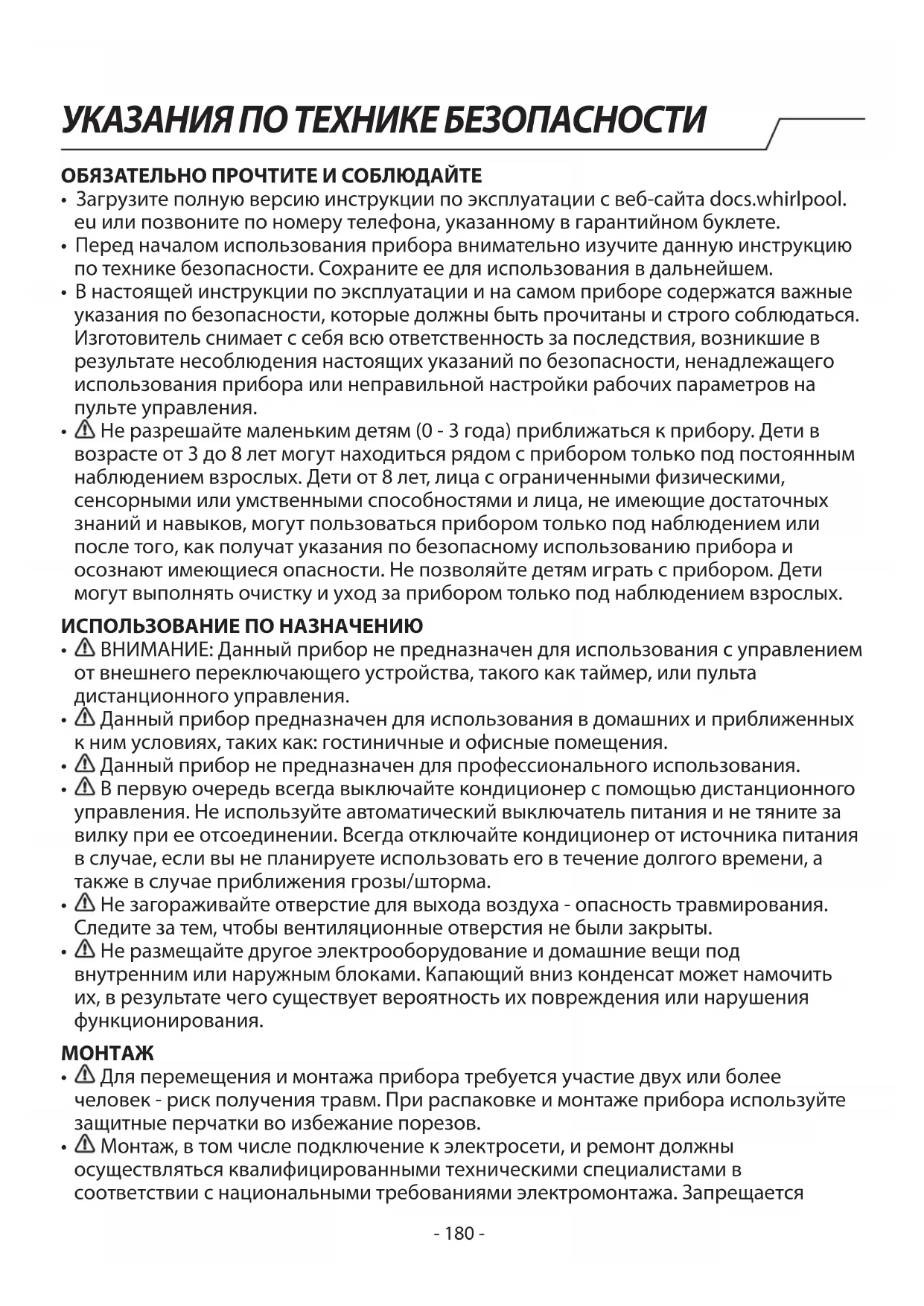 Монтаж, в том числе подключение к электросети, и ремонт должны осуществляться квалифицированными техническими специалистами в соответствии с национальными требованиями электромонтажа. Запрещается УКАЗАНИЯ ПО ТЕХНИКЕ БЕЗОПАСНОСТИ- 181 - ремонтировать или заменять любые детали прибора, за исключением случаев, особо оговоренных в руководстве по эксплуатации. Не разрешайте детям подходить близко к месту монтажа. После распаковки прибора убедитесь, что он не поврежден во время транспортировки. В случае обнаружения проблем обращайтесь к продавцу или в ближайший сервисный центр. По окончании монтажа отходы упаковочных материалов (пластик, пенопластовые детали ит.д.) должны храниться в недоступном для детей месте во избежание опасности удушения. Перед выполнением любых операций по монтажу отключите прибор от электросети - опасность поражения электрическим током. При установке соблюдайте осторожность, чтобы не повредить сетевой шнур корпусом прибора - опасность пожара и поражения электрическим током. Не включайте прибор до завершения монтажа.