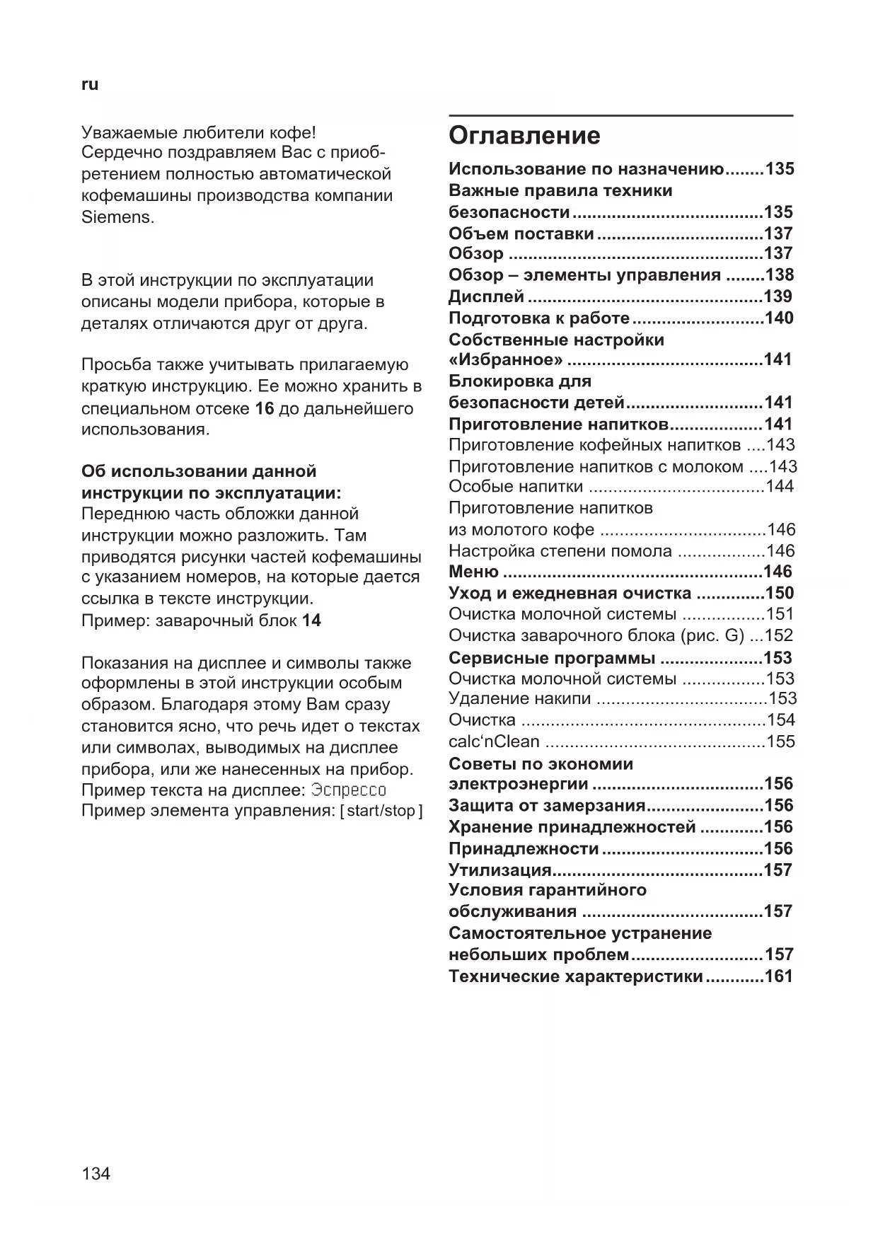 - Уважаемыелюбителикофе! СердечнопоздравляемВассприоб- ретениемполностьюавтоматической кофемашиныпроизводствакомпании Siemens. Вэтойинструкциипоэксплуатации описанымоделиприбора,которыев деталяхотличаютсядруготдруга. Просьбатакжеучитыватьприлагаемую краткуюинструкцию.Ееможнохранитьв специальномотсеке16додальнейшего использования. Об использовании данной инструкции по эксплуатации: Переднюючастьобложкиданной инструкцииможноразложить.Там приводятсярисункичастейкофемашины суказаниемномеров,накоторыедается ссылкавтекстеинструкции. Пример:заварочныйблок14 Показаниянадисплееисимволытакже оформленывэтойинструкцииособым образом.БлагодаряэтомуВамсразу становитсяясно,чторечьидетотекстах илисимволах,выводимыхнадисплее прибора,илиженанесенныхнаприбор. Примертекстанадисплее:Эспрессо Примерэлементауправления:C Использование по назначению 135 Важные правила техники безопасности 135 Объем поставки 137 Обзор 137 Обзор – элементы управления 138 Дисплей 139 Подготовка к работе 140 Собственные настройки «Избранное» 141 Блокировка для безопасности детей 141 Приготовление напитков 141 Приготовлениекофейныхнапитков p. 143