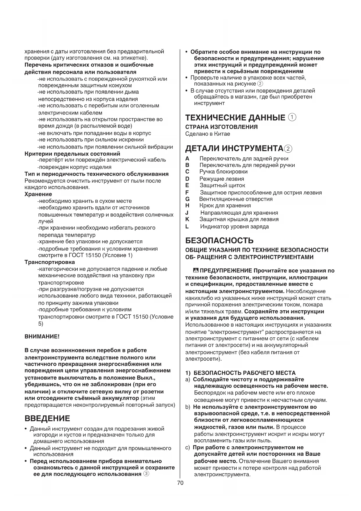A Переключатель для задней ручки B Переключатель для передней ручки C Ручка блокировки D Режущие лезвия E Защитный щиток F Защитное приспособление для острия лезвия G Вентиляционные отверстия H Крюк для хранения J Направляющая для хранения K Защитная крышка для лезвия L Индикатор уровня заряда БЕЗОПАСНОСТЬ ОБЩИЕ УКАЗАНИЯ ПО ТЕХНИКЕ БЕЗОПАСНОСТИ ОБ- РАЩЕНИЯ С ЭЛЕКТРОИНСТРУМЕНТАМИ - ПРЕДУПРЕЖЕНИЕ Прочитайте все указания по технике безопасности, инструкции, иллюстрации и спецификации, предоставленные вместе с настоящим электроинструментом. Несоблюдение какихлибо из указанных ниже инструкций может стать причиной поражения электрическим током, пожара и/или тяжелых травм. Сохраняйте эти инструкции и указания для будущего использования. Использованное в настоящих инструкциях и указаниях понятие “электроинструмент” распространяется на электроинструмент с питанием от сети (с кабелем питания от электросети) и на аккумуляторный электроинструмент (без кабеля питания от электросети).